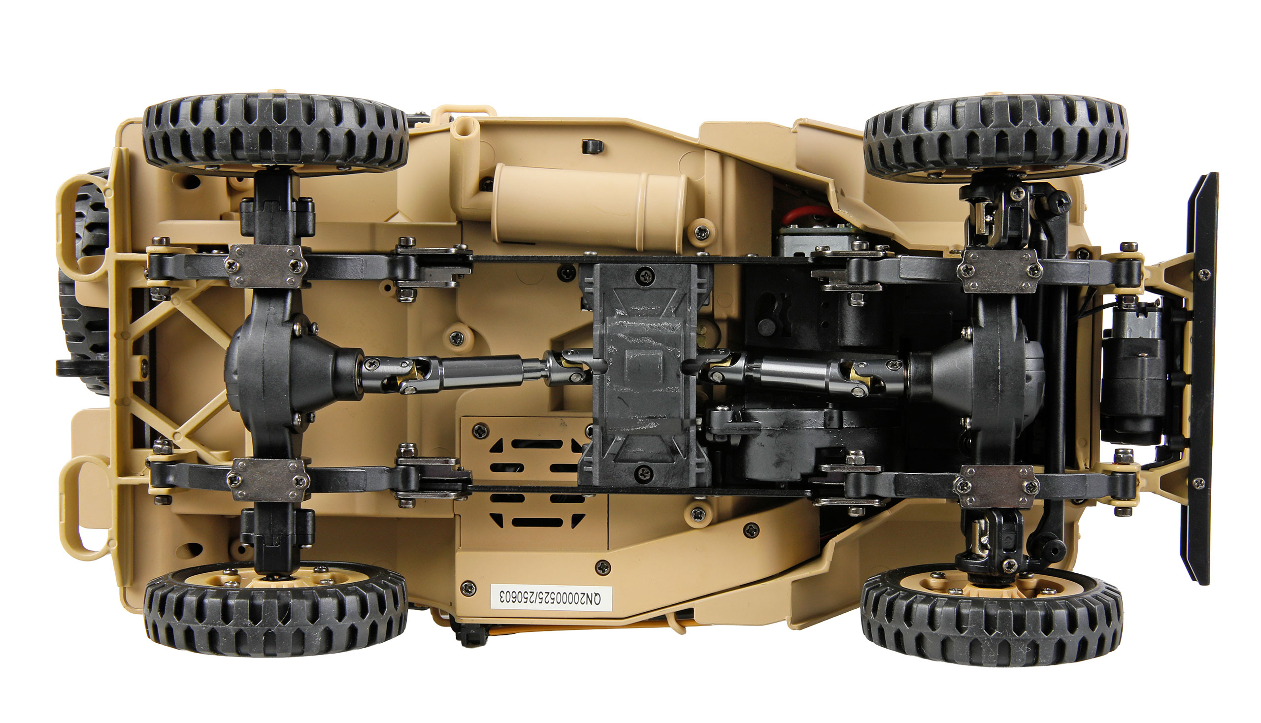 Der Amewi Jeep Willys MB Scale Crawler 4WD 1:14 RTR in Sand ist ein ferngesteuertes Geländefahrzeug im Maßstab 1:14, das durch seine detailgetreue Bauweise,