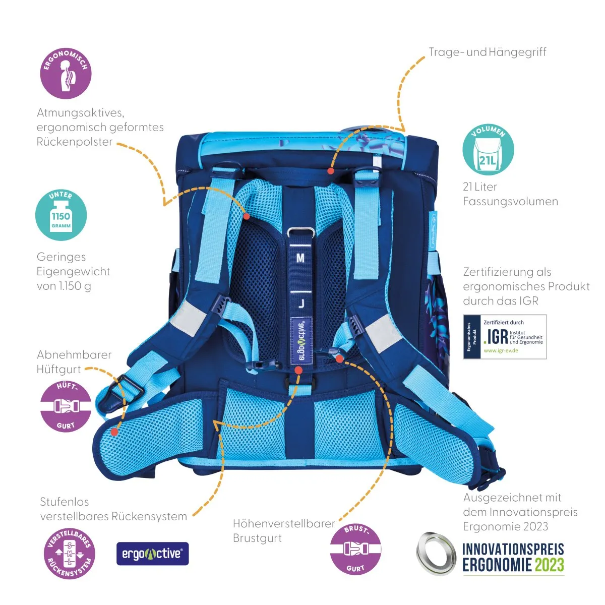 Das atmungsaktive Rückenpolster, die breiten, gepolsterten Schultergurte sowie der verstellbare Brust- und Hüftgurt entlasten den Rücken und sorgen für eine gleichmäßige Gewichtsverteilung. Mit seinem geräumigen Hauptfach mit integriertem Bücherfach, der praktischen Fronttasche mit Reißverschluss und den flexiblen Seitentaschen bietet er genügend Stauraum für alle Schulmaterialien.