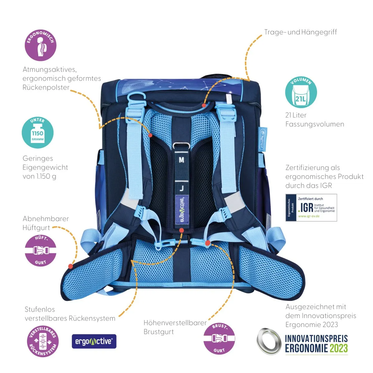 Dank des atmungsaktiven, ergonomischen Rückenpolsters, der gepolsterten, verstellbaren Schultergurte sowie des verstellbaren Brust- und Hüftgurts bietet der Schulranzen höchsten Tragekomfort. Das geräumige Hauptfach mit Bücherfach, die praktische Fronttasche mit Reißverschluss und die elastischen Seitentaschen bieten ausreichend Platz für alle Schulutensilien.