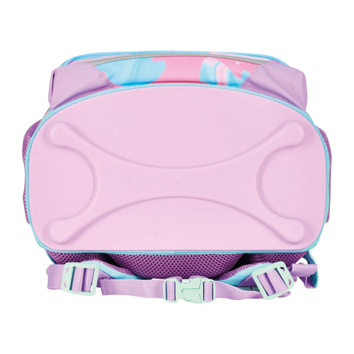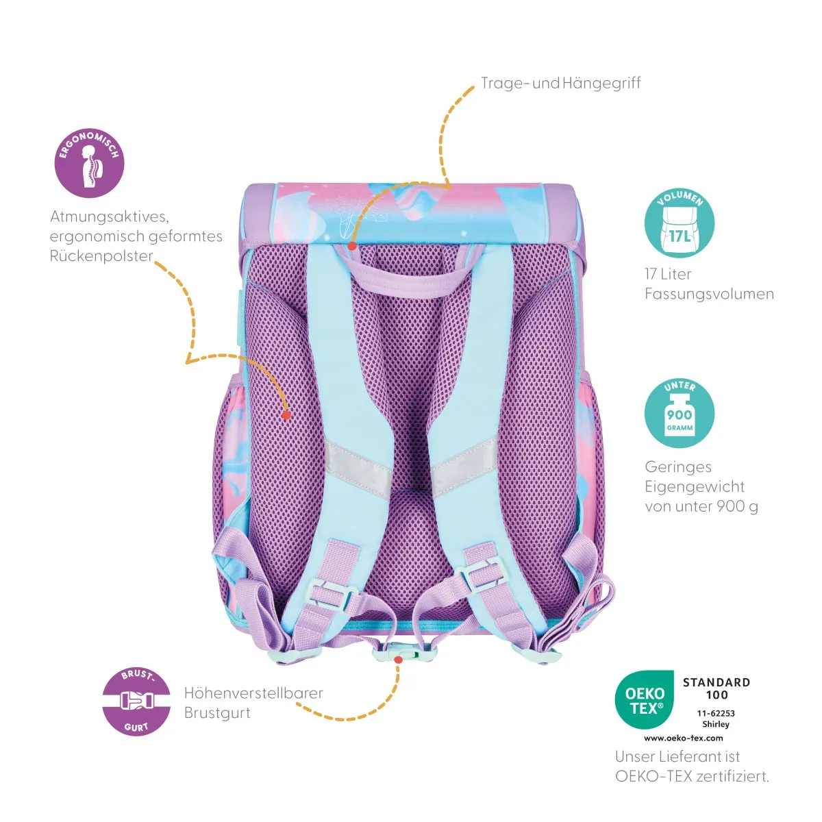 Das ergonomisch geformte, atmungsaktive Rückenpolster, die gepolsterten, verstellbaren Schultergurte sowie der höhenverstellbare Brustgurt sorgen für eine ideale Passform und eine rückenschonende Gewichtsverteilung. Das geräumige Hauptfach mit integriertem Bücherfach, die praktische Fronttasche mit Reißverschluss und zwei elastische Seitentaschen bieten viel Stauraum für Schulmaterialien.