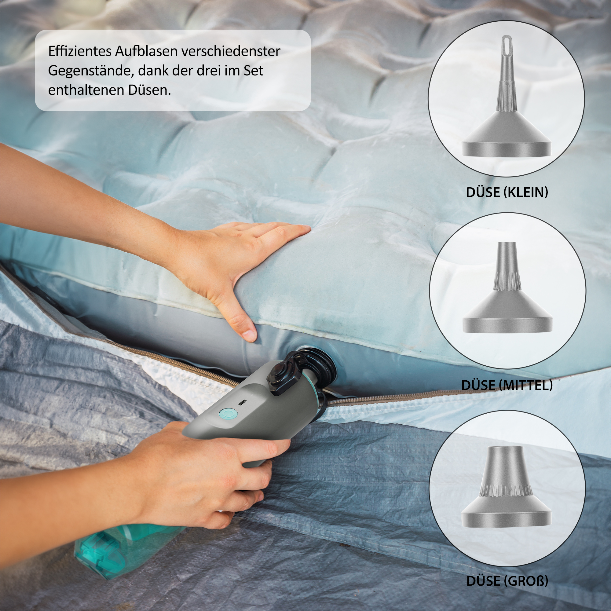 Mit einer starken Saugleistung entfernt der Handstaubsauger effizient Staub, Schmutz und Krümel von Polstermöbeln, Autositzen oder schwer erreichbaren Ecken. Die integrierte Luftpumpenfunktion ist perfekt, um Luftmatratzen, Schwimmringe oder Bälle in kürzester Zeit aufzupumpen. Das Set umfasst acht Zubehörteile, darunter verschiedene Düsen und Aufsätze, die das Gerät noch flexibler machen.