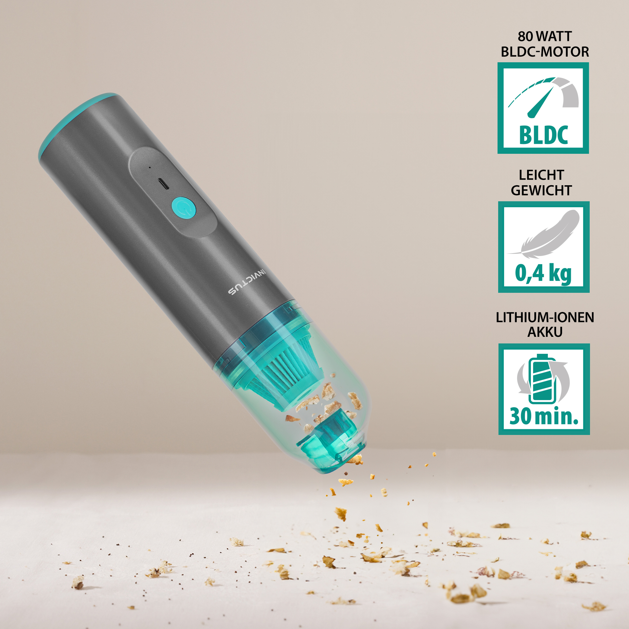 - Der Handstaubsauger bietet eine starke Saugleistung, die ideal für kleine Reinigungsarbeiten ist.