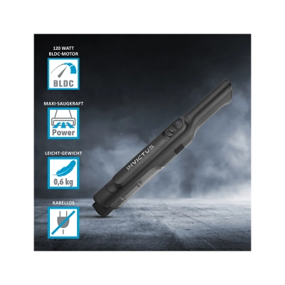 Der INVICTUS ONE PRIMUS ist ein leistungsstarker Handstaubsauger mit einem BLDC-Motor mit 120 Watt, der für zuverlässige Saugleistung sorgt – ideal
