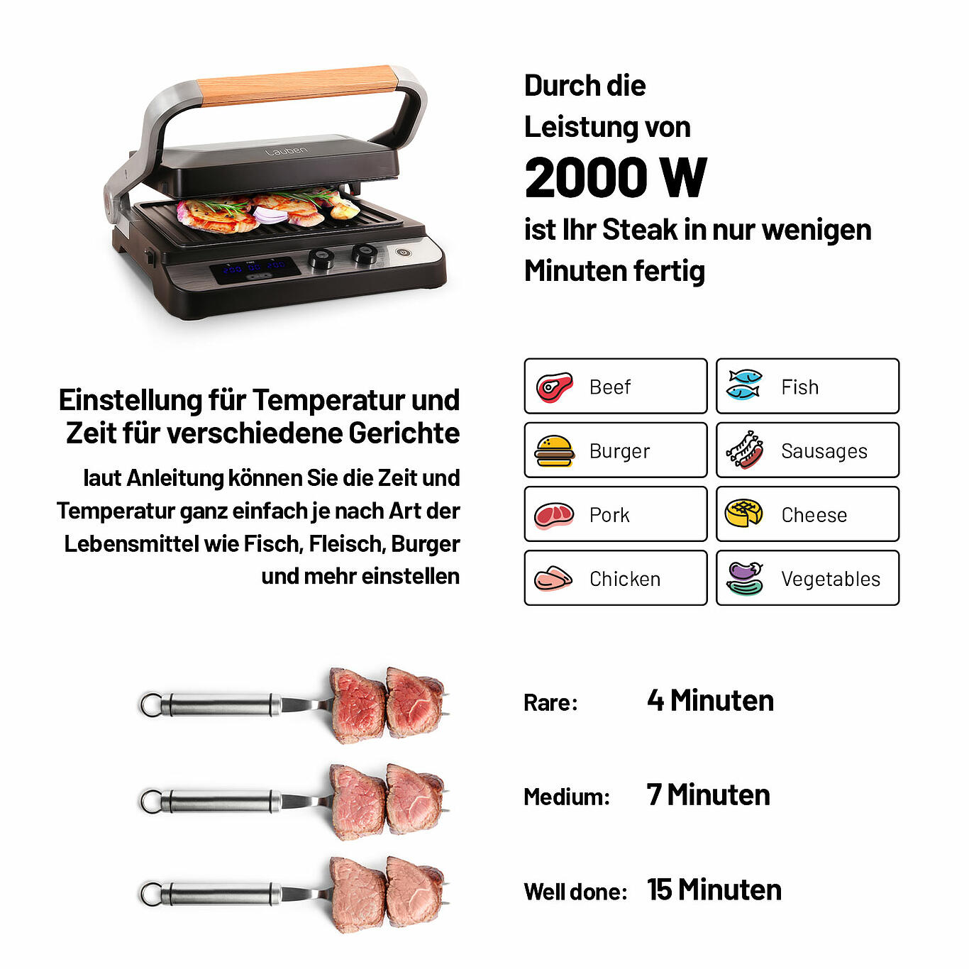 Erleben Sie Grillgenuss bei jedem Wetter mit dem vielseitigen Lauben-Kontaktgrill. Mit einer Leistung von 2000 W und einer Grillfläche von 1500cm² bietet der Grill sowohl die Funktion eines Back- als auch eines Tischgrills. Ideal für saftige Burger, frischen Fisch oder köstliche Panini.Produktmerkmale: