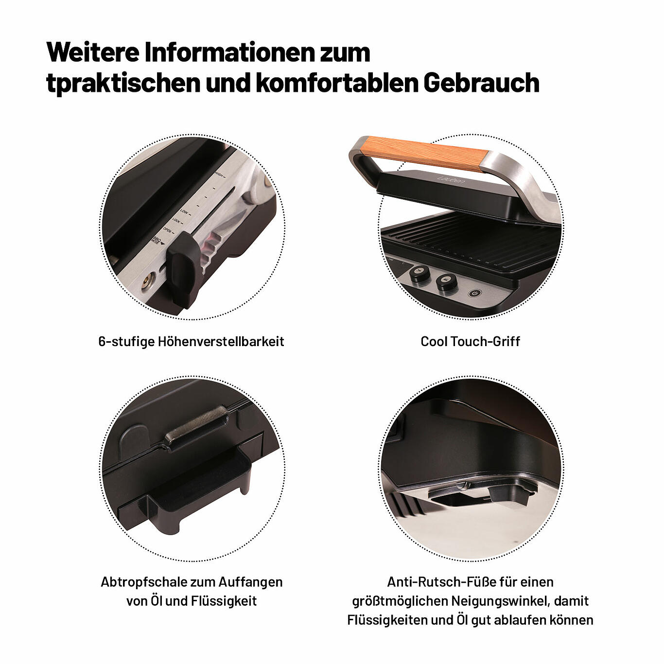 • Einfache Reinigung: Abnehmbare, spülmaschinenfeste Grillplatten und praktische Abtropfschale.
