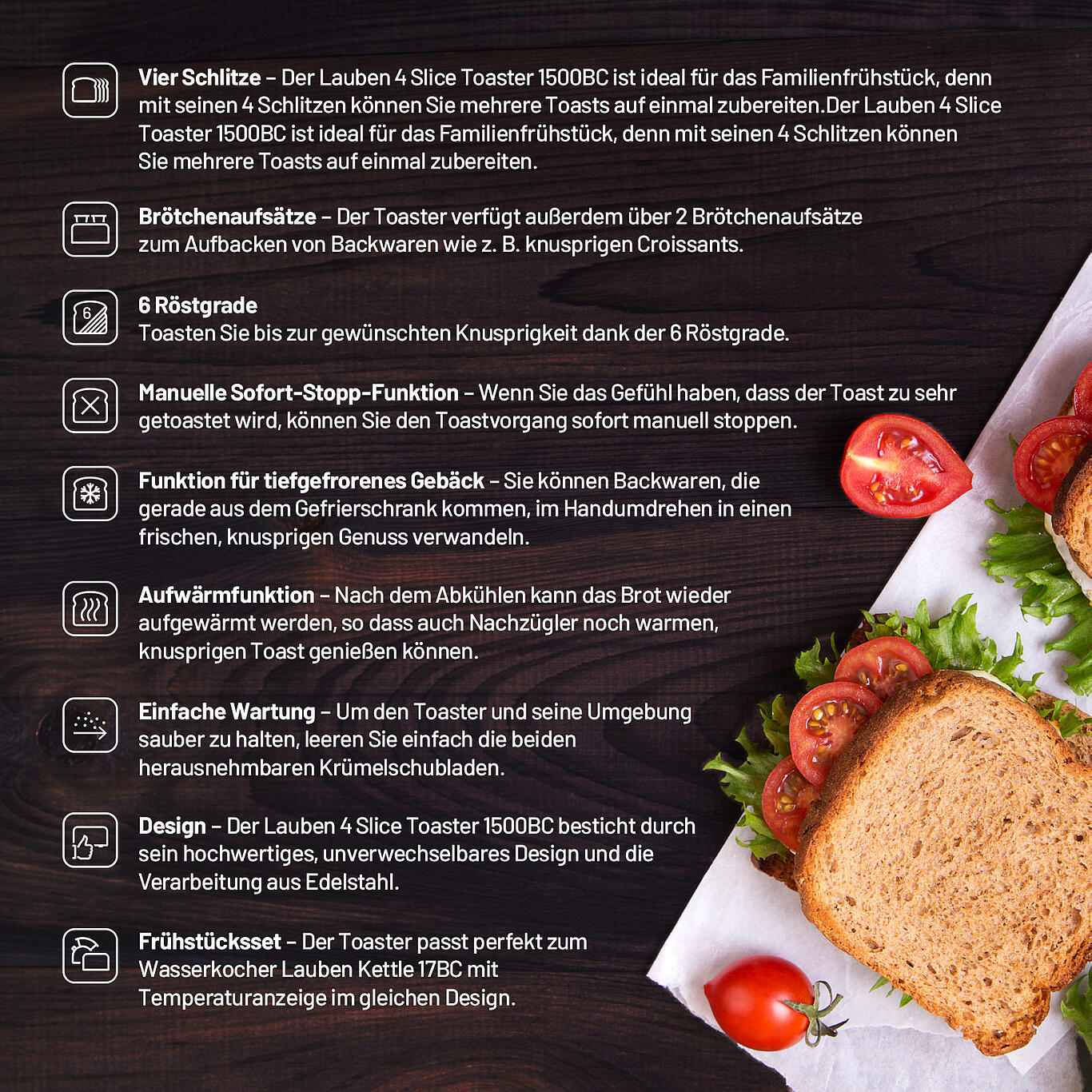 Neben dem Toasten bietet der Lauben 4 Slice Toaster eine Gebäckaufwärmfunktion, die gefrorene Bachwaren schnell und einfach aufwärmen. Zusätzlich sorgt die Aufwärmfunktion dafür, dass auch später kommende Familienmitglieder waren Toast genießen können. Das hochwertige Edelstahldesign des Toasters ist nicht nur stilvoll, sondern auch praktisch. Das Kabel kann im Sockel verstaut werden. Die herausnehmbaren Krümelschubladen ermöglichen eine einfache Reinigung.Produktmerkmale: