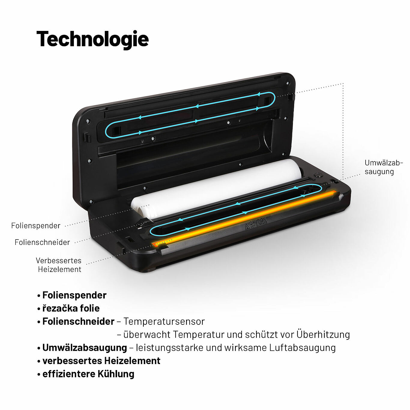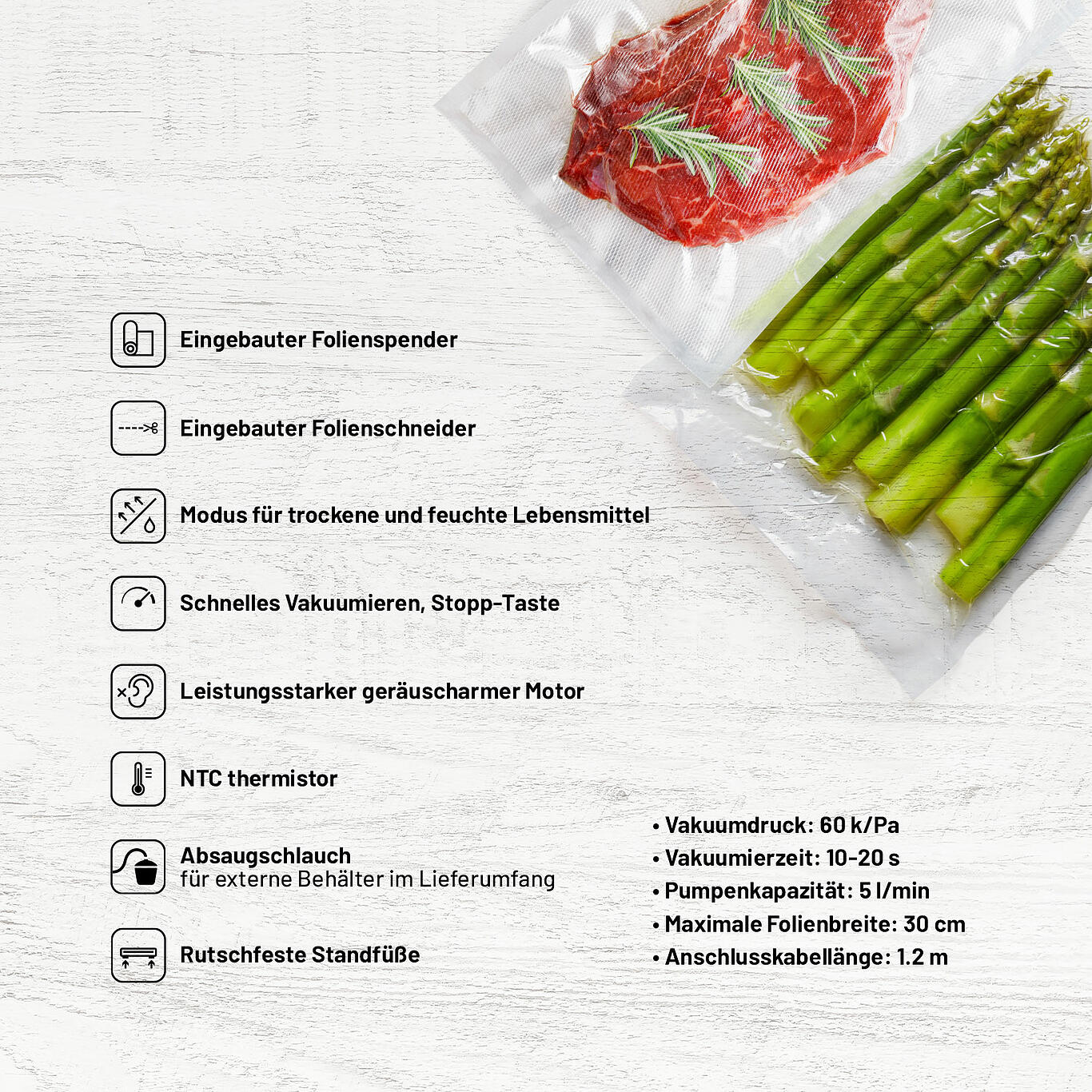 • Vielseitigkeit: Verlängert die Haltbarkeit von Gemüse, Gebäck, Fleisch, Suppen und sogar Torten.