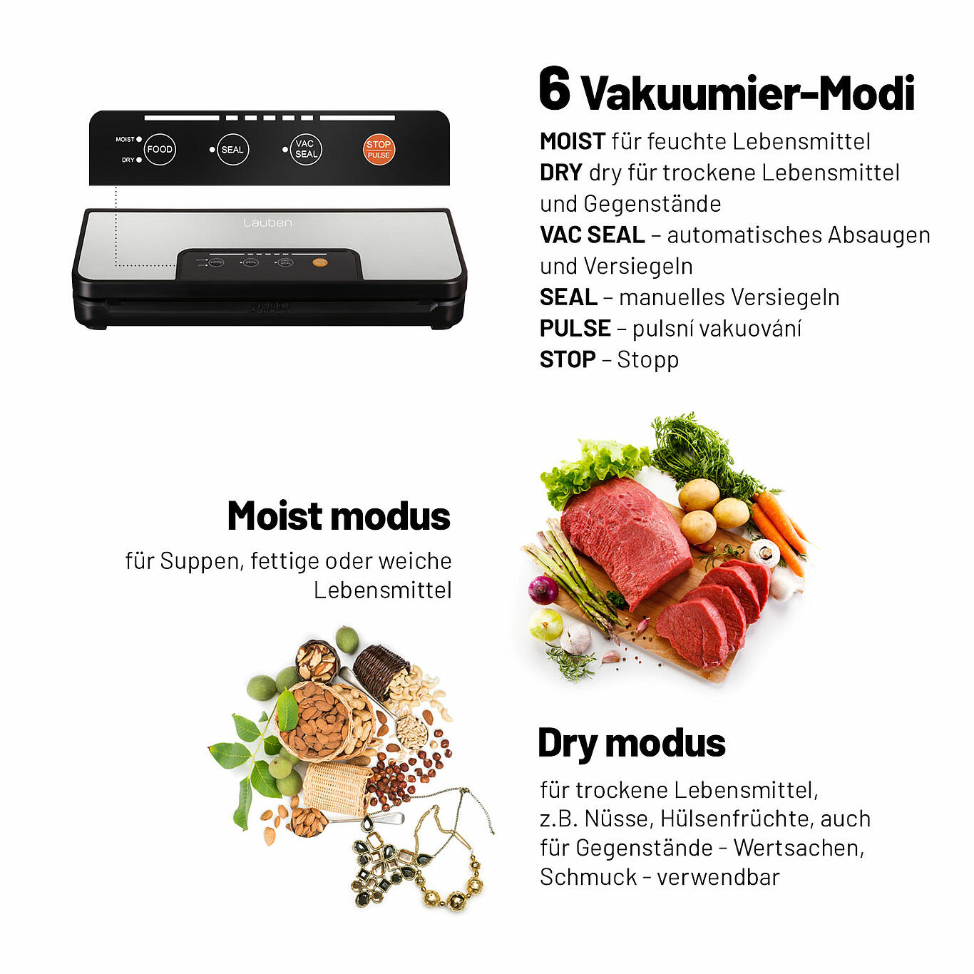 • Einfache Bedienung: Tasten zu Auswahl des richtigen Vakuumierprozesses für verschiedene Lebensmitteltype (feucht, trocken, weich, hart).