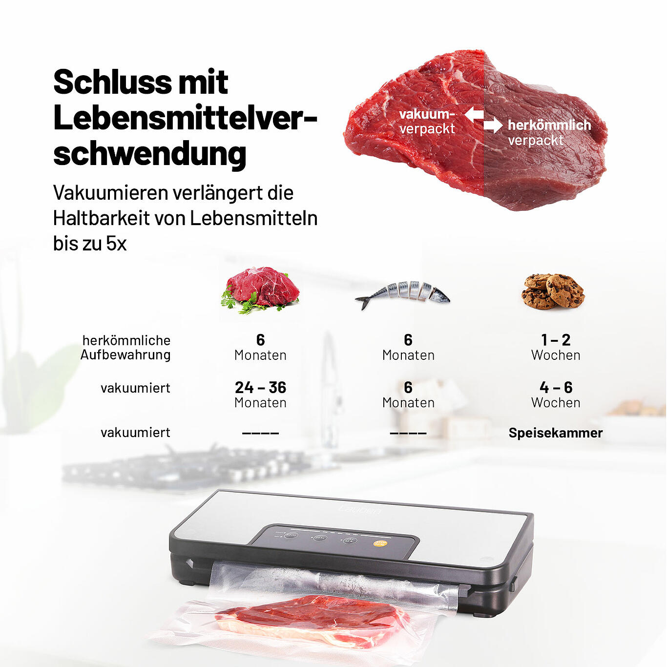 Das Lauben Vakuumiergerät ist ein effektiver Helfer gegen Lebensmittelverschwendung. Durch das Absaugen des Sauerstoffs verlangsamt der Vakuumierer den Oxidationsprozess, der Lebensmittel verderben lässt. Die spezielle Folie, schützt die Lebensmittel im Kühl- oder Gefrierschrank vor Feutigkeit.