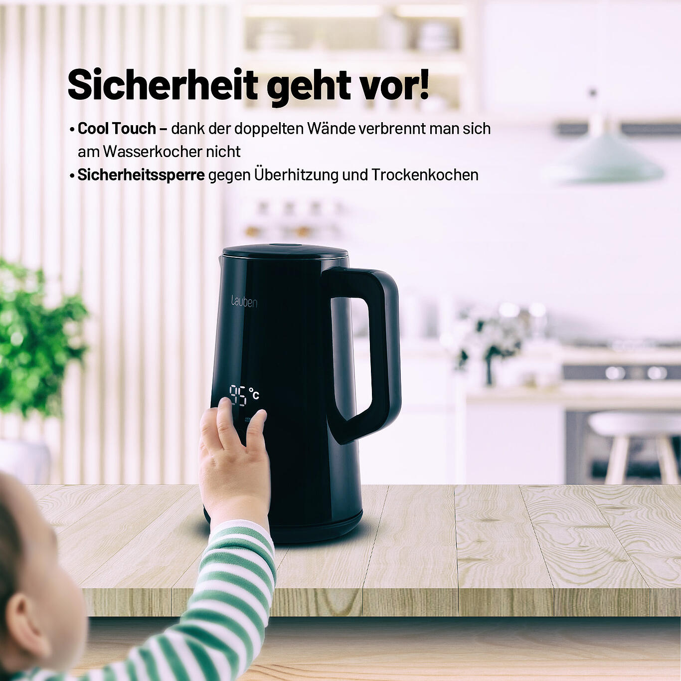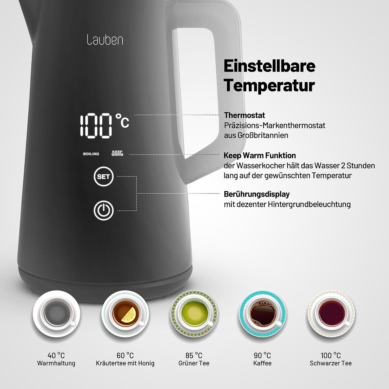 Der Wasserkocher von Lauben, kombiniert praktischen Nutzen mit stilvollem Design. In elegantem schwarz und mit einer großen Digitalanzeige erhitzt er Wasser präzise auf die gewünschte Temperatur (40-100 °C) und hält es danke der Keep-Warm-Funktion bis zu 2 Stunden warm. Die doppelten Wände sorgen für zusätzliche Isolierung und verhindern, dass die Außenseite heiß wird.