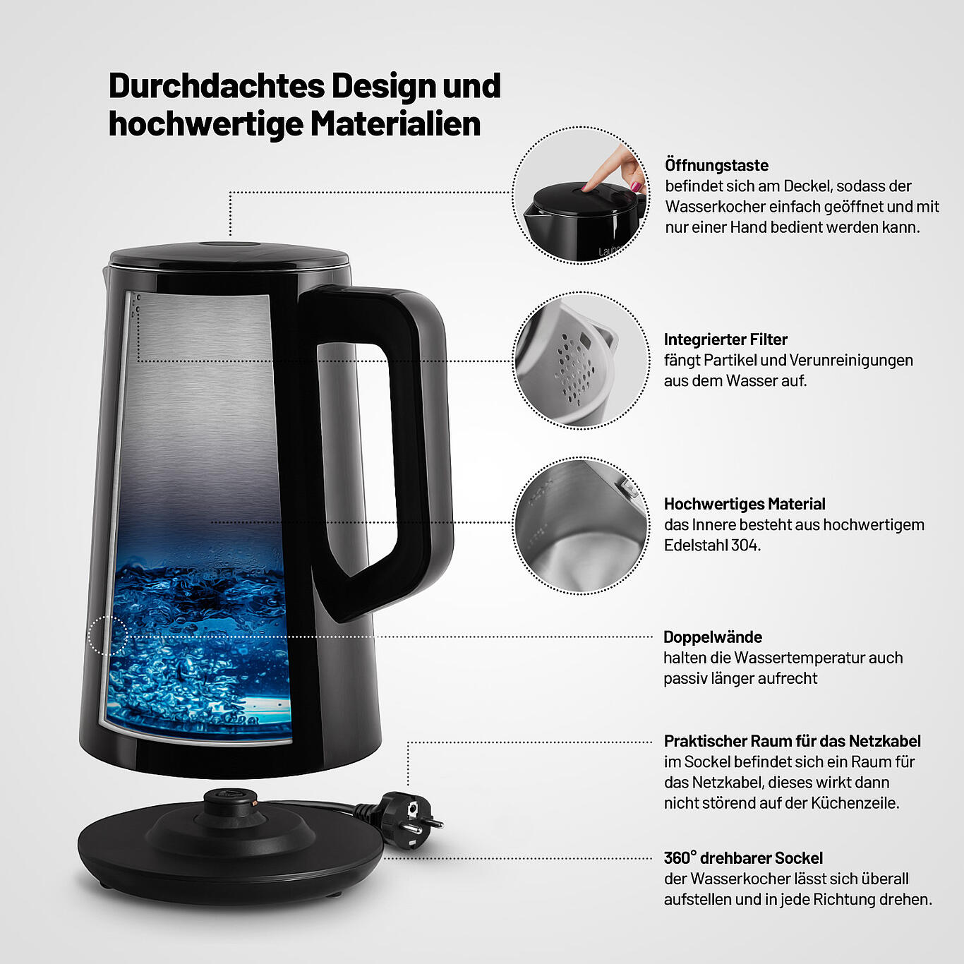 • Praktische Design: 360°C drehbarer Sockel, verdecktes Kabel und ein hochwertiges Edelstahl-Innenteil.