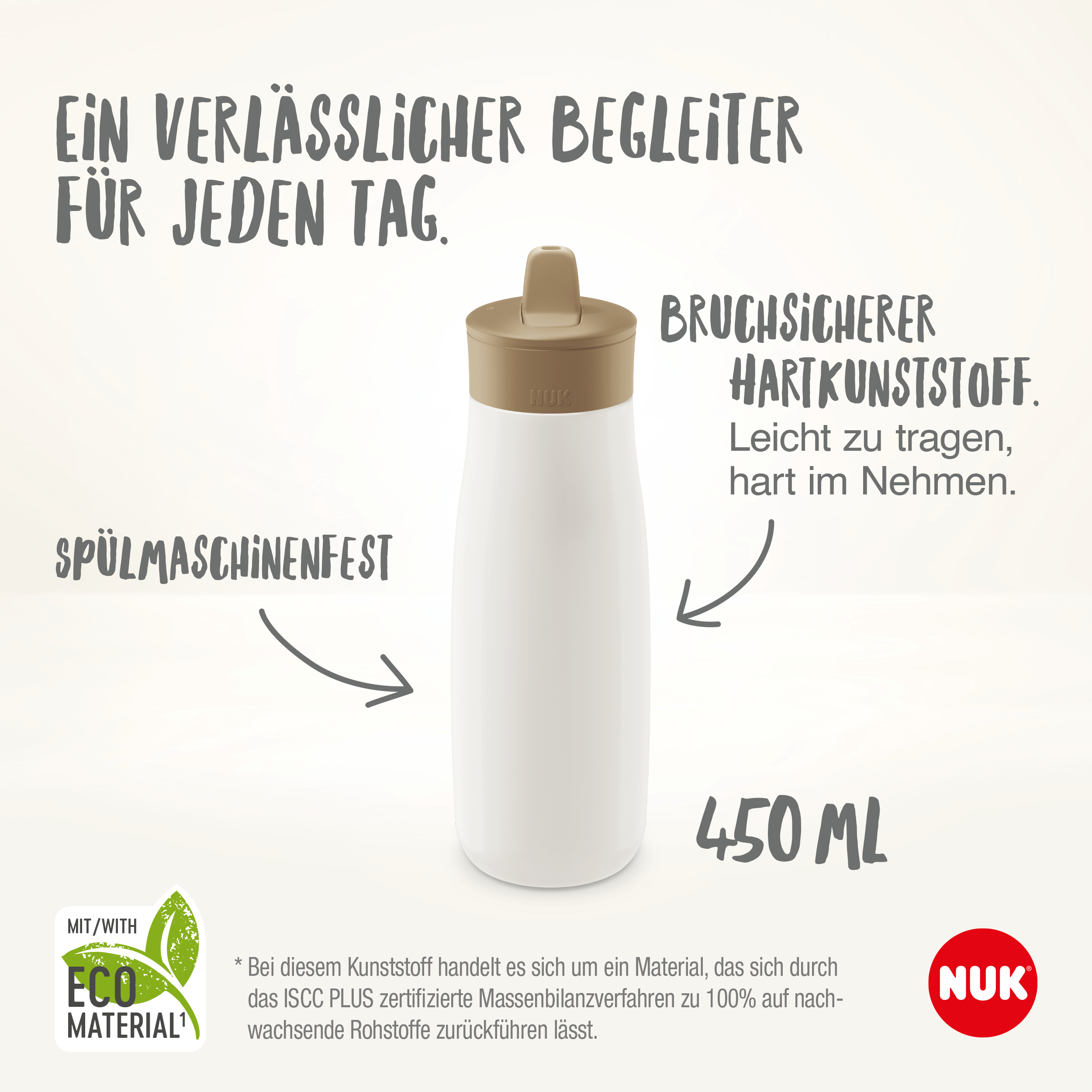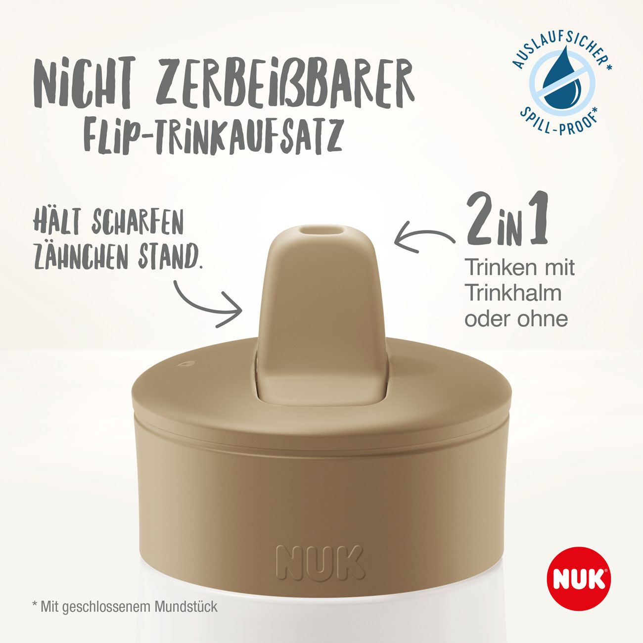 Diese Trinkflasche ist perfekt für die Entdeckungstouren Ihres Kindes geeignet. Der innovative 2in1-Trinkaufsatz verwandelt sich mühelos vom Stohhalmbecher zur Trinkflasche. Ideal für alle Altersstufen ab 12 Monaten. Mit ihrem modernen Design und über 80% nachhaltigen Materialien setzt die Flasche umweltfreundliche Akzente.