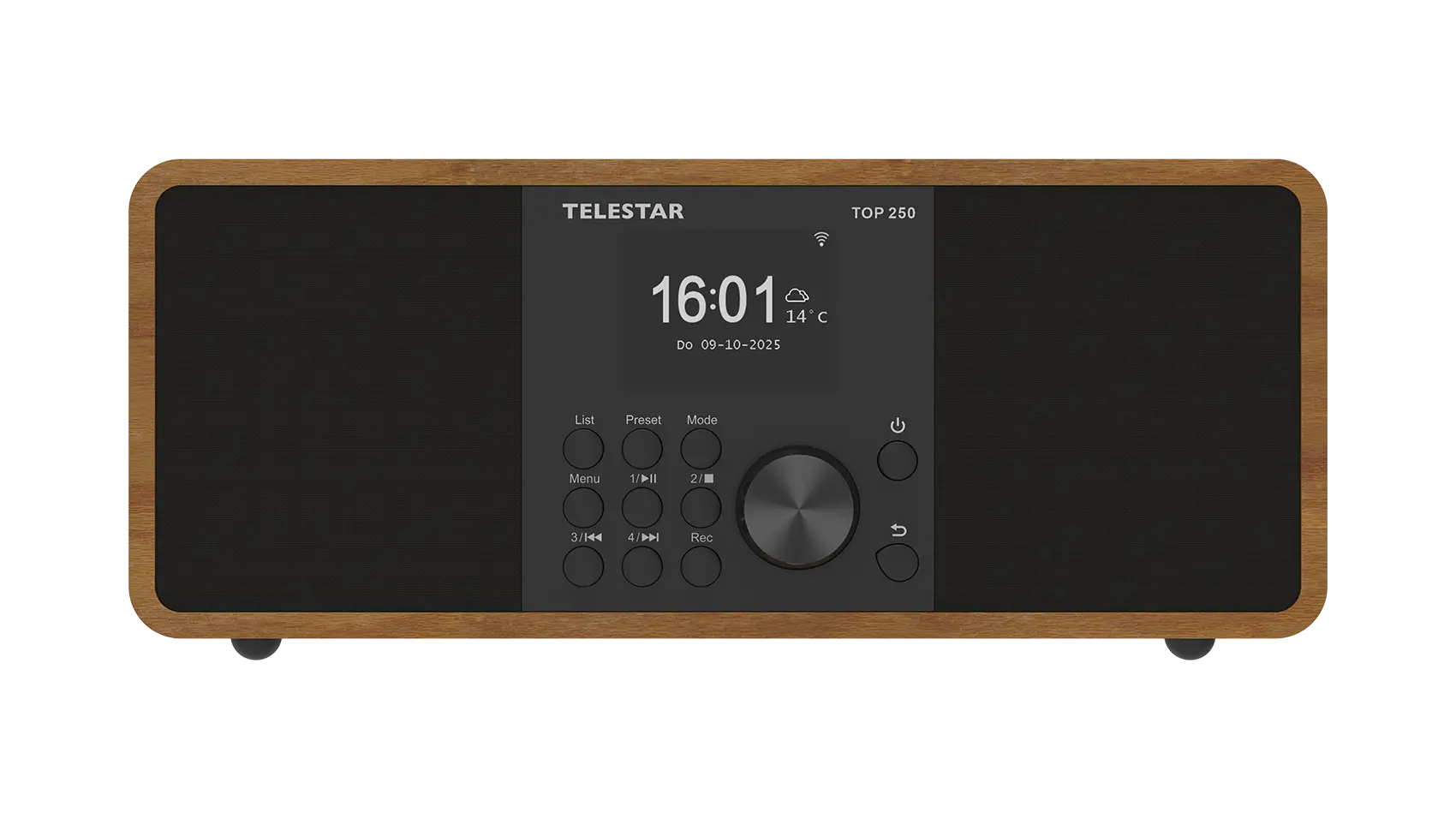 Das TELESTAR TOP 250 Holz ist ein kompaktes DAB+/UKW- und Internetradio im stilvollen Holzgehäuse, das moderne Technik mit klassischem Design verbindet. Mit Bluetooth 5.3, UPnP und 2,4 GHz WLAN bietet es vielseitige Streaming-Möglichkeiten. Die Steuerung erfolgt bequem per Fernbedienung oder über die Soundmate App für iOS und Android.