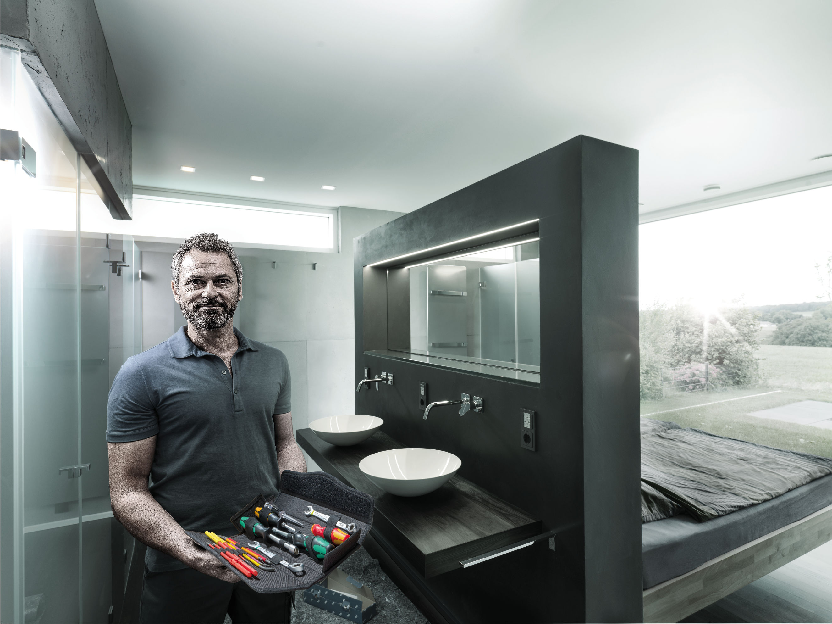 Kompaktes Werkzeug-Set mit 15 wichtigen Schraubwerkzeugen für den Sanitär- und Heizungsbereich. Mit 2 Joker Switch Maulschlüsseln, VDE Handhalter plus 4 extra slim Klingen, 1 einpoliger Phasentester 247, 4 schlauchummantelten Winkelschlüsseln, Schraubmeißel und 2 Kraftform Plus Schraubendrehern mit Hohlschaft.