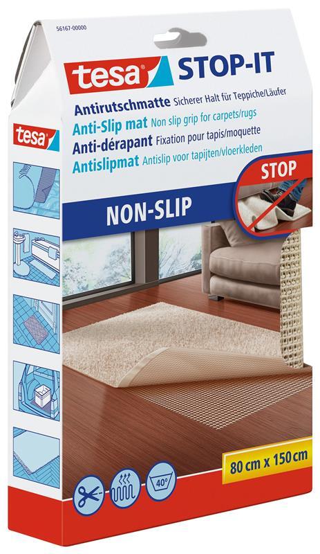 Die nicht klebende tesa Stop-it® Anti-Rutschmatte verhindert zuverlässig das Verrutschen und die Wellenbildung von Teppichen, Brücken und Läufern auf allen glatten Böden, z.B. Parkett oder Laminat. Die hochwertige Teppichunterlage sorgt für einen sicheren Halt und reduziert das Risikopotenzial von "glitschigen" Teppichen.
