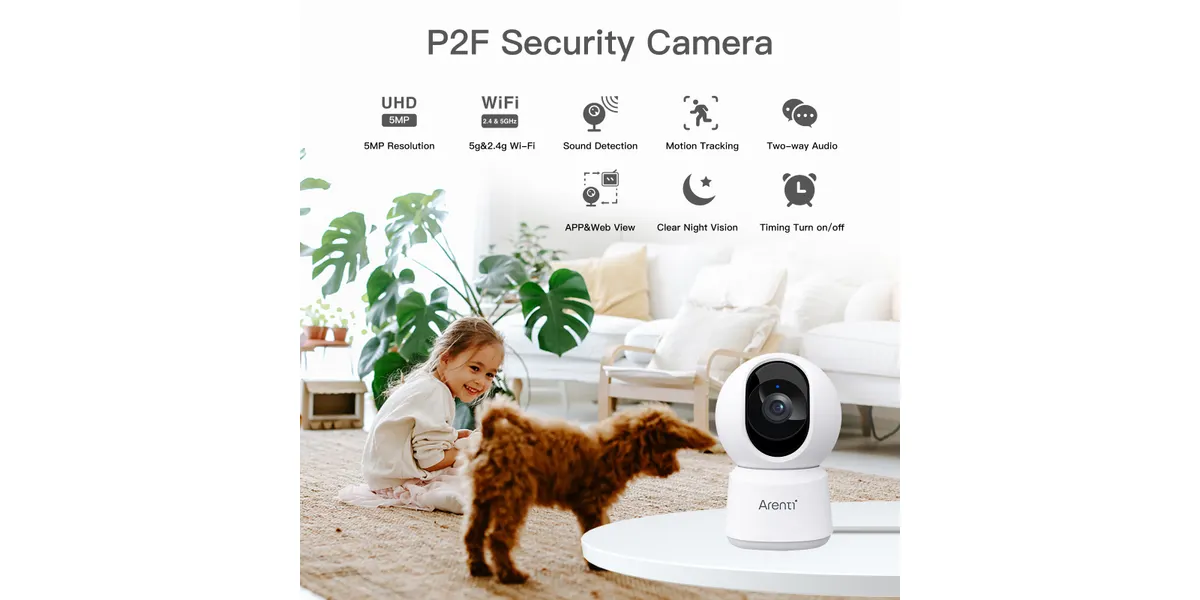 Die Arenti P2F Indoor Kamera ist eine moderne Pan-Tilt-Zoom Sicherheitskamera für den Innenbereich mit 5MP UHD-Auflösung (3K). Sie bietet gestochen scharfe Bilder, flexible Schwenk- und Neigefunktion sowie eine komfortable Steuerung über die Arenti-App (Android/iOS). Dank Dual-Band Wi-Fi (2.4 GHz & 5 GHz) ist eine stabile Verbindung gewährleistet.