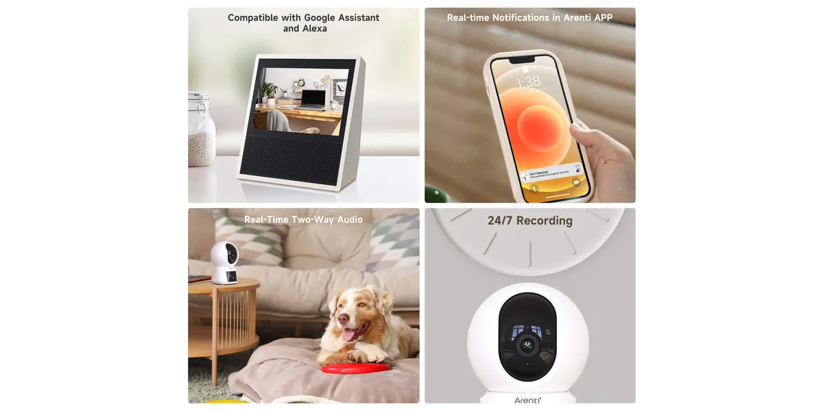 Die Kamera unterstützt Dual-Band Wi-Fi (2.4 GHz & 5 GHz) und ist mit Bewegungserkennung, Zwei-Wege-Audio und Nachtsicht ausgestattet. Über die Arenti-App (Android/iOS) lassen sich Live-Bilder abrufen, Aufnahmen speichern und Benachrichtigungen empfangen. Sie ist ideal für die Innenraumüberwachung von Wohnräumen, Büros oder Kinderzimmern.