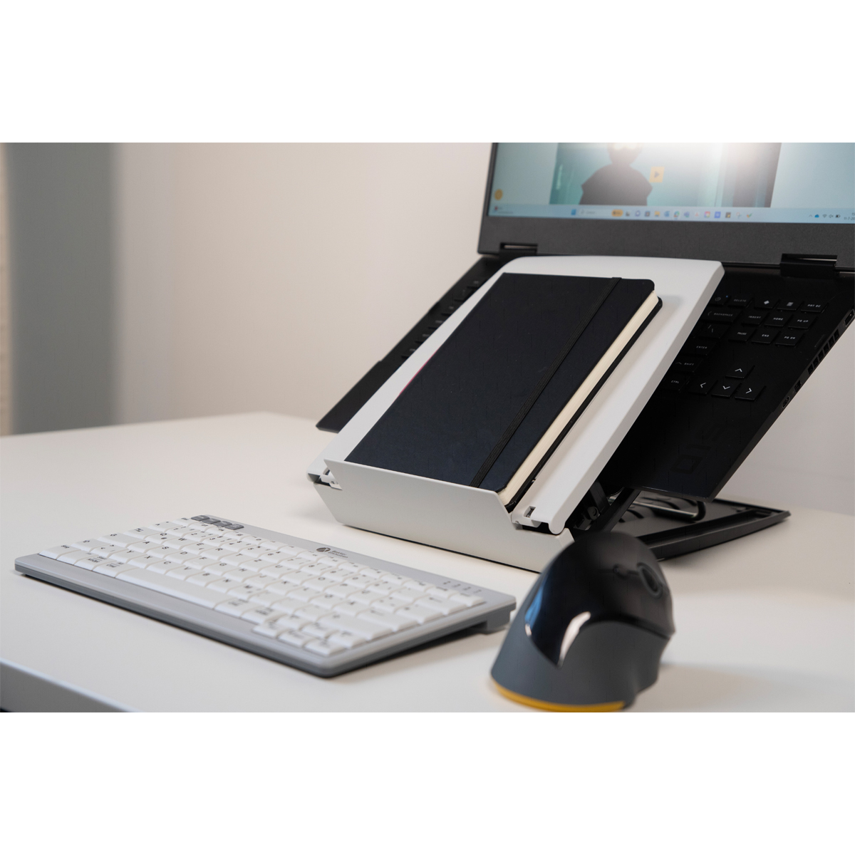 Die höhenverstellbare Konstruktion ermöglicht eine individuelle Anpassung an unterschiedliche Arbeitsplätze und Nutzerbedürfnisse, wodurch eine ergonomische Arbeitsweise gefördert wird. Gleichzeitig sorgt die stabile Bauweise für einen sicheren Stand des Notebooks während der Nutzung.