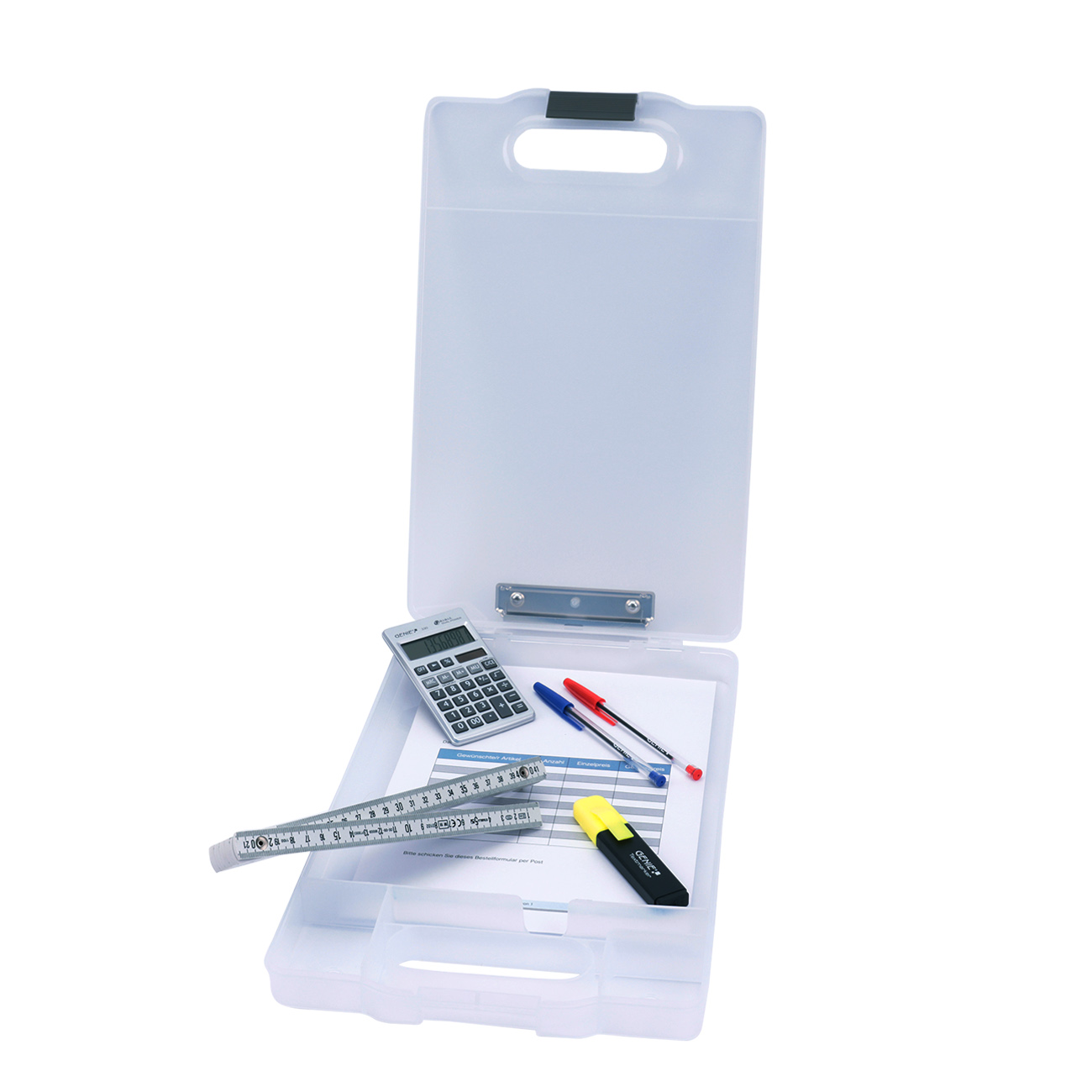 Die transparente Ausführung ermöglicht eine schnelle Sicht auf den Inhalt, wodurch Dokumente leichter organisiert und identifiziert werden können. Das Gehäuse aus widerstandsfähigem Kunststoff ist bruchsicher und feuchtigkeitsabweisend, wodurch sich das Klemmbrett auch für den täglichen Einsatz eignet.