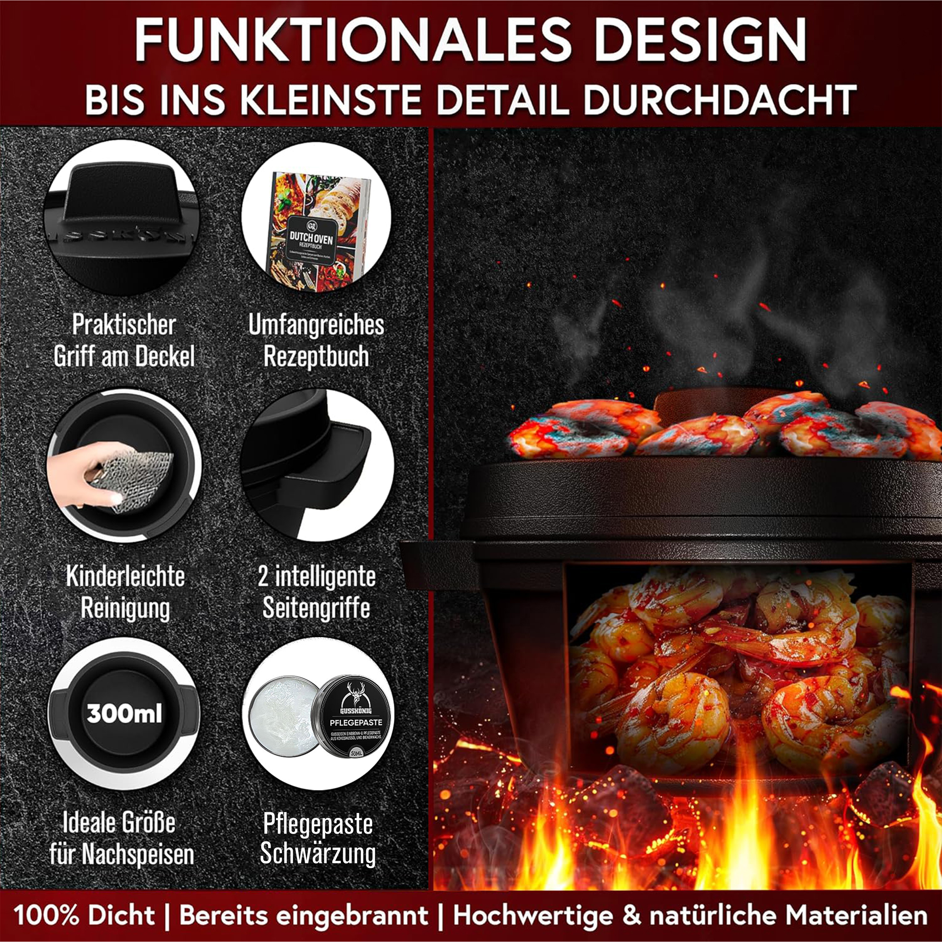 Das GUSSKÖNIG Mini Dutch Oven Set besteht aus sechs kleinen Gusseisentöpfen mit einem Fassungsvermögen von jeweils 300 ml. Die Töpfe werden bereits eingebrannt geliefert und sind ohne zusätzliche Vorbereitung sofort einsatzbereit.
