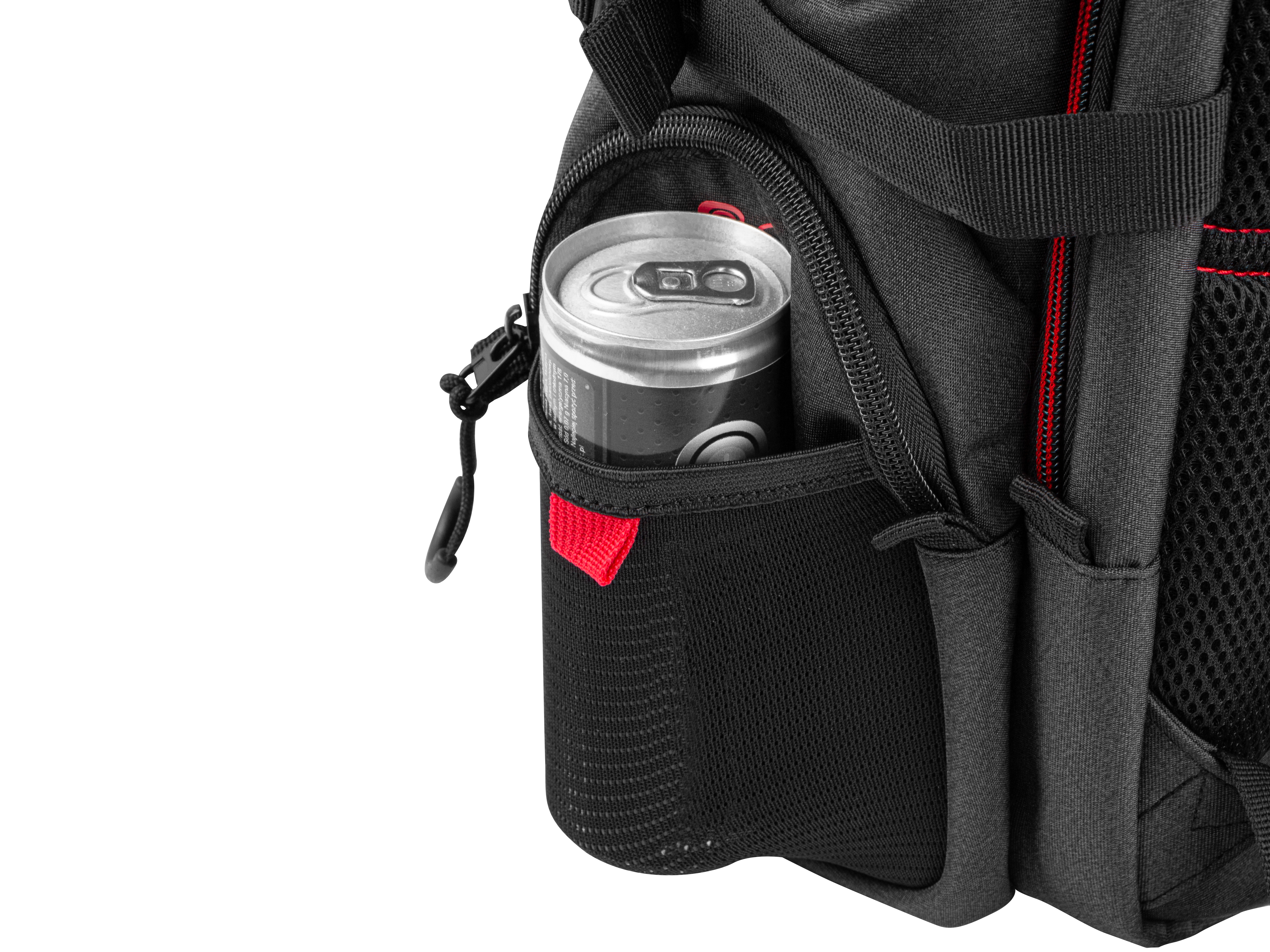 - Vier Außentaschen, darunter zwei Netztaschen für Getränke.