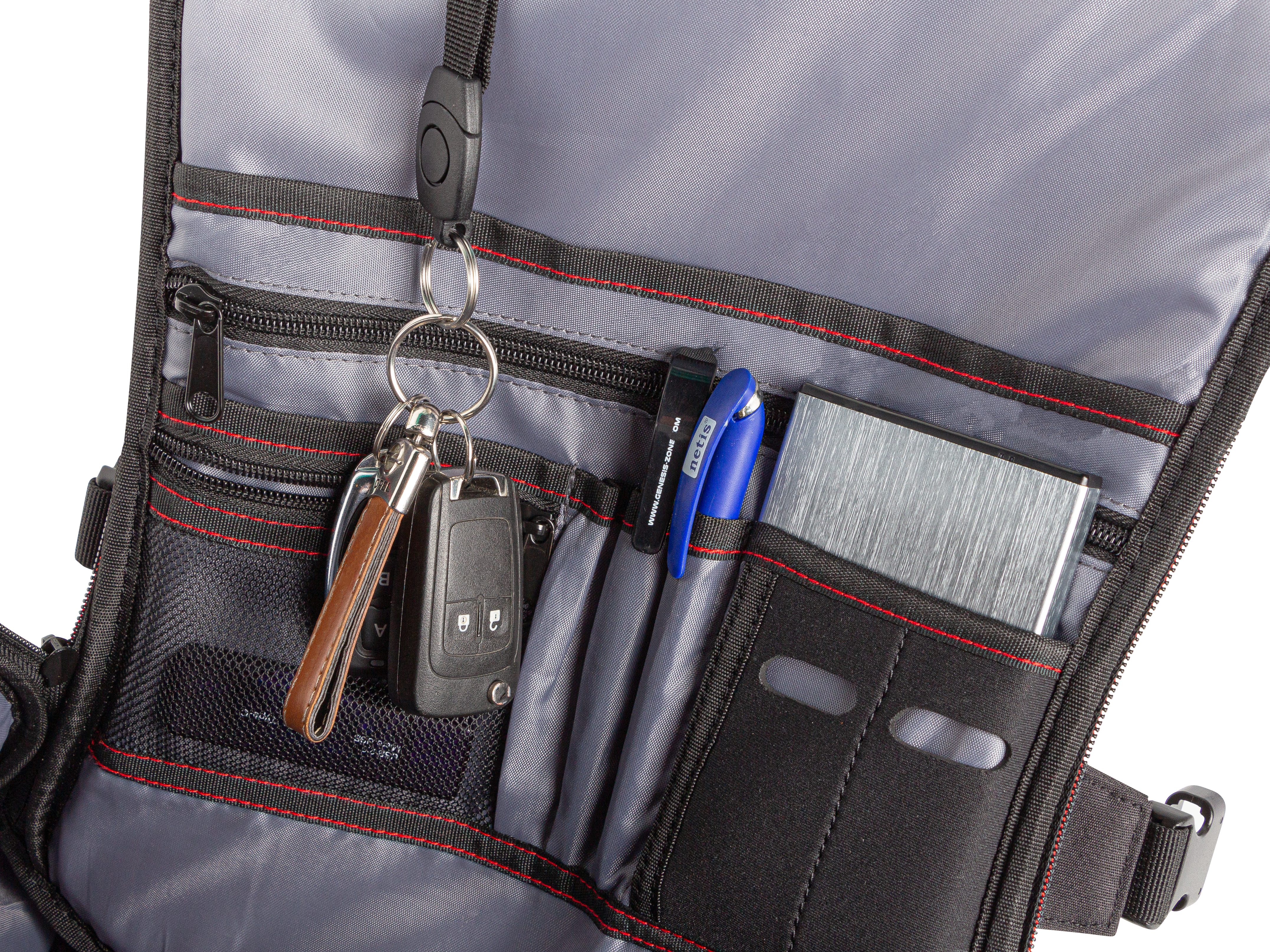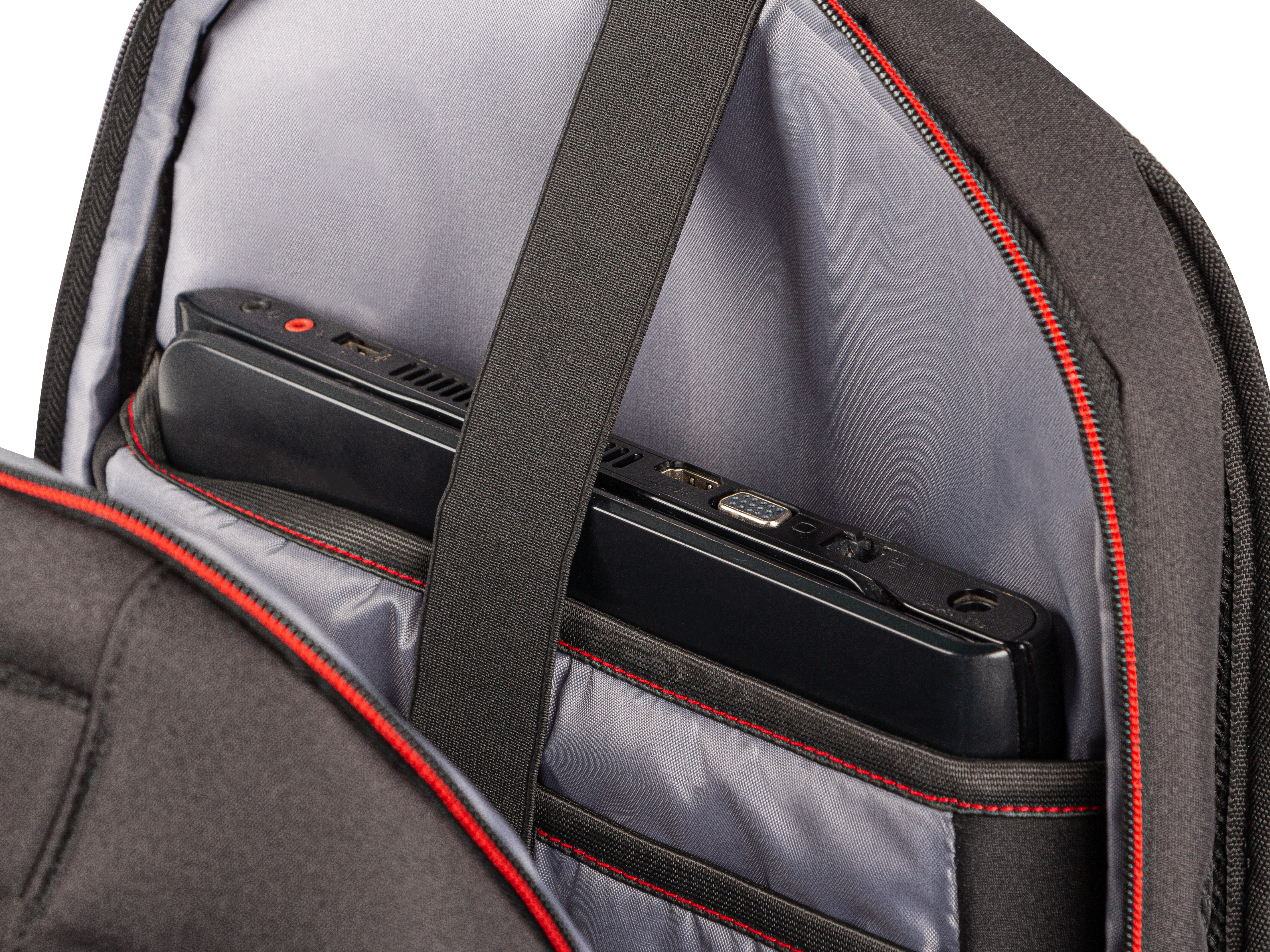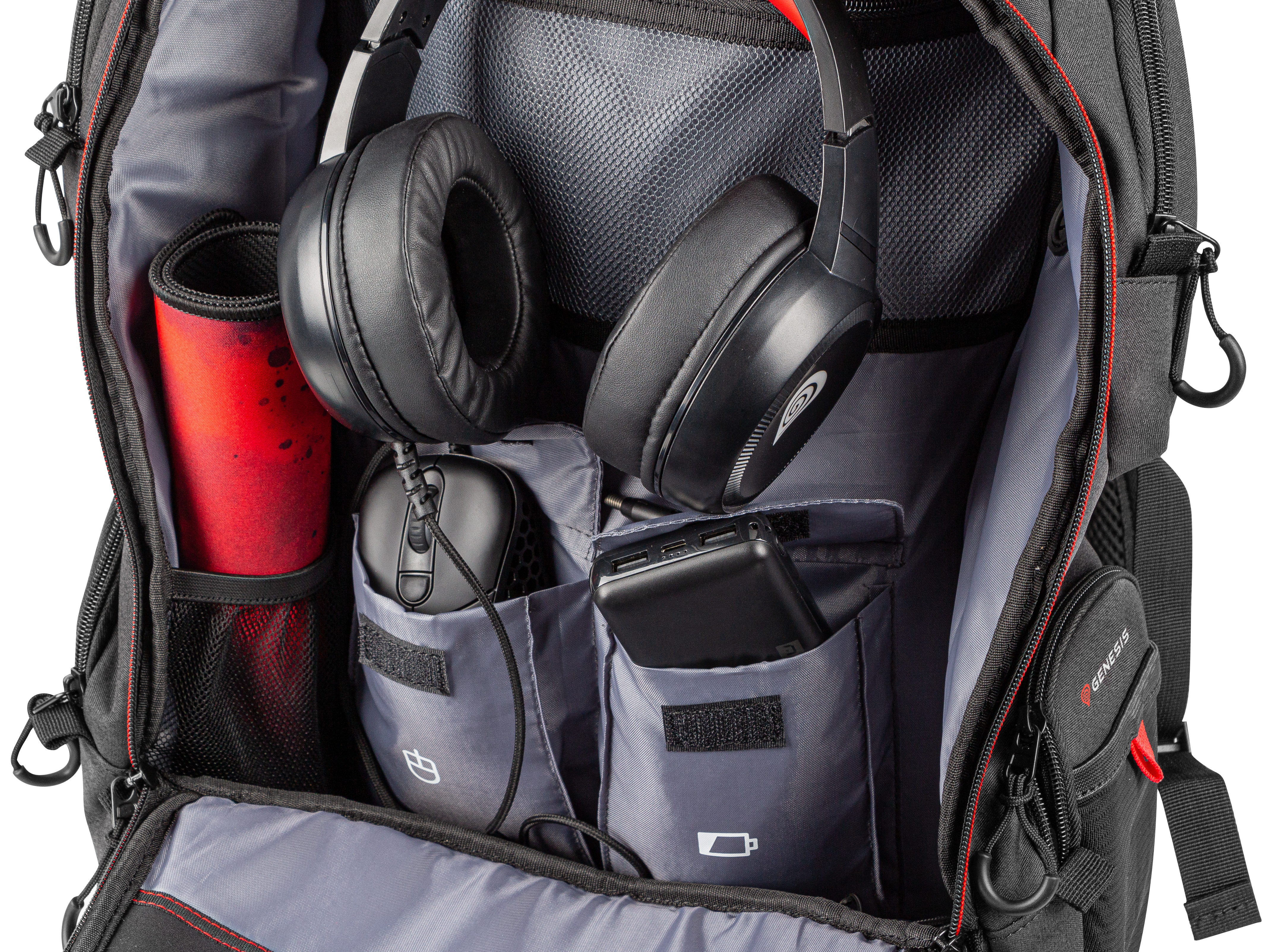 - Geräumiges Hauptfach mit mehreren leicht zugänglichen Taschen für Headset,