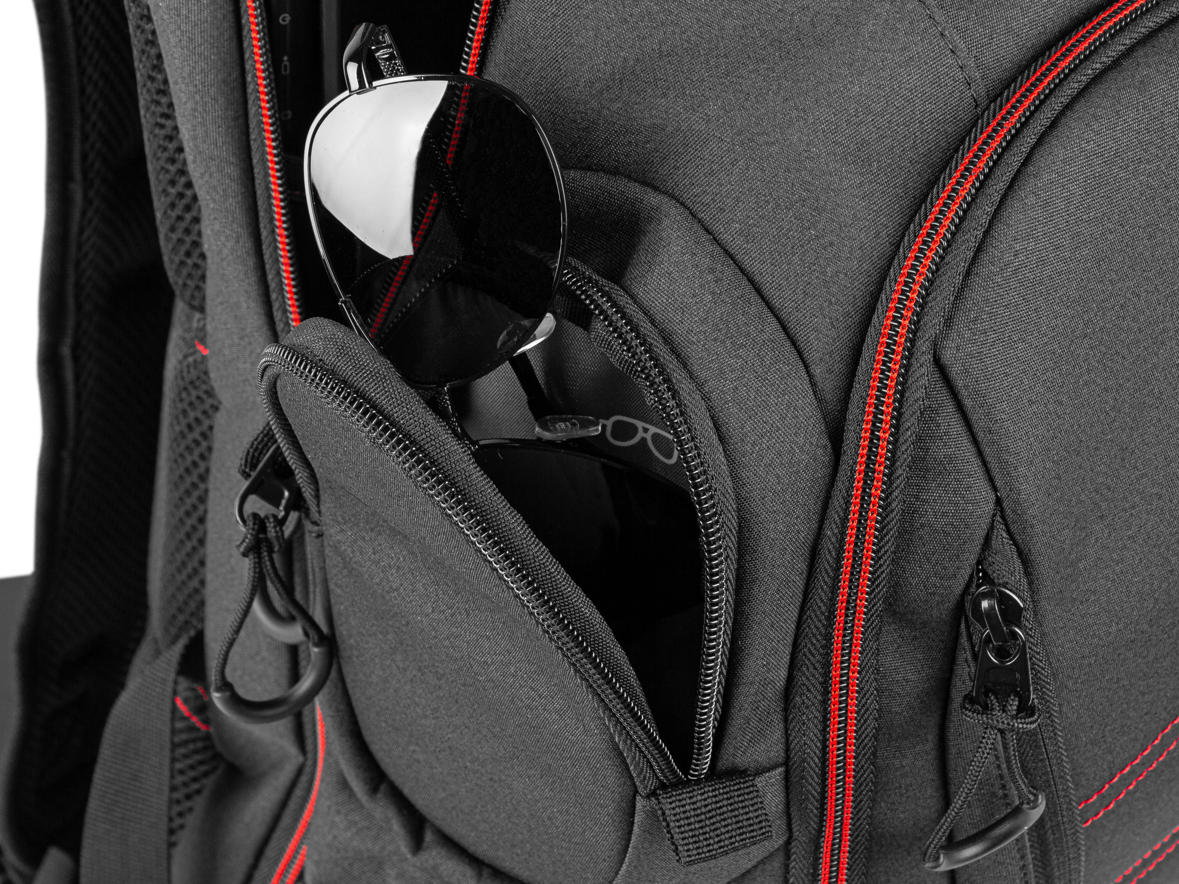 - Seitentasche für Brillen mit verstärktem Innenraum für zusätzlichen Schutz.