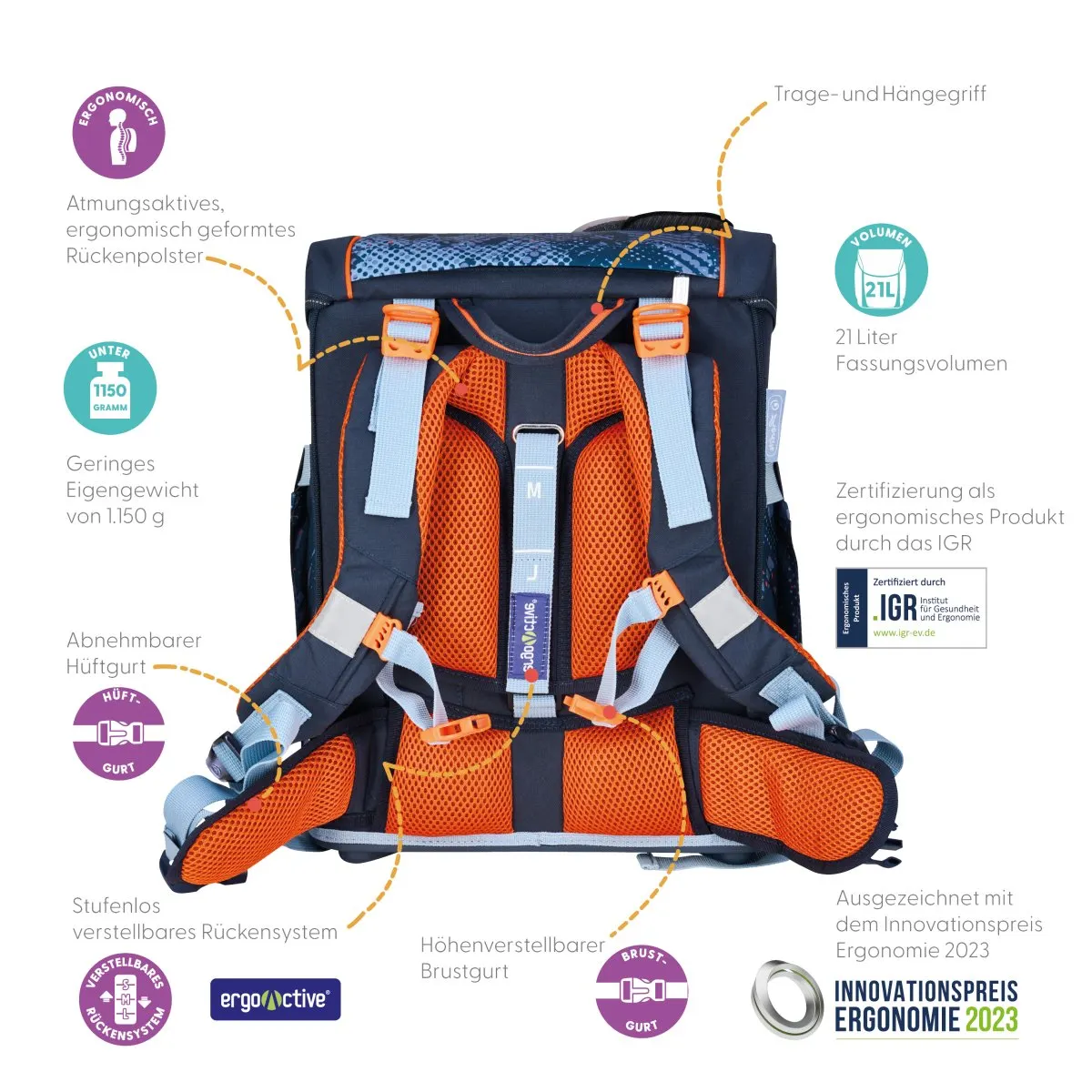 Das höhenverstellbare ErgoActive®-Tragesystem, das atmungsaktive, ergonomische Rückenpolster, die breiten, gepolsterten Schultergurte sowie der verstellbare Brust- und Hüftgurt garantieren eine perfekte Passform und entlasten den Rücken. Mit seinem großen Hauptfach mit Bücherfach, der praktischen Fronttasche mit Reißverschluss und den elastischen Seitentaschen bietet er jede Menge Stauraum für Schulmaterialien.