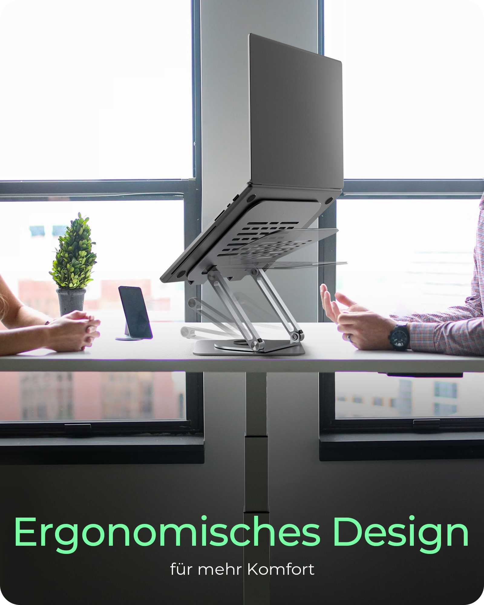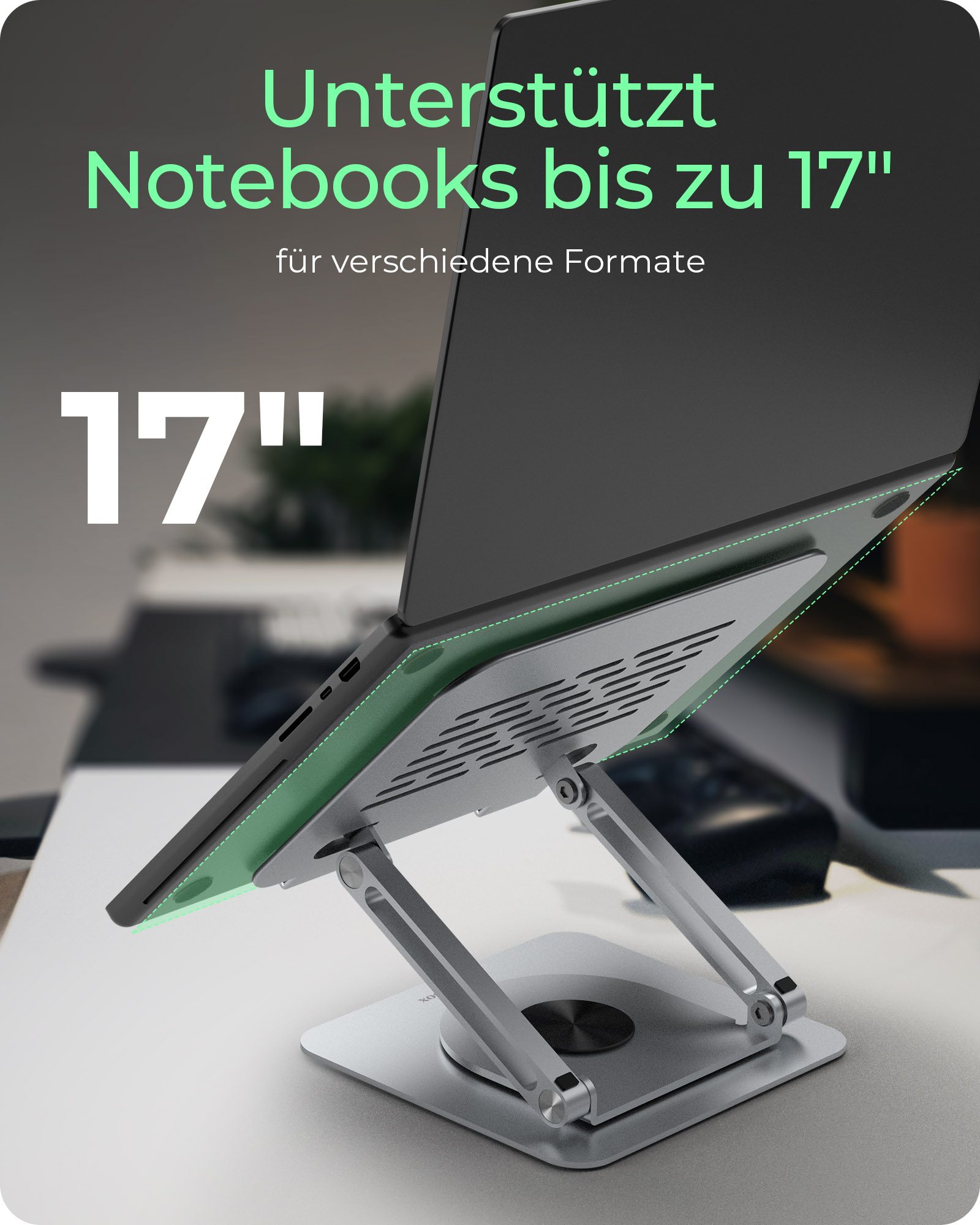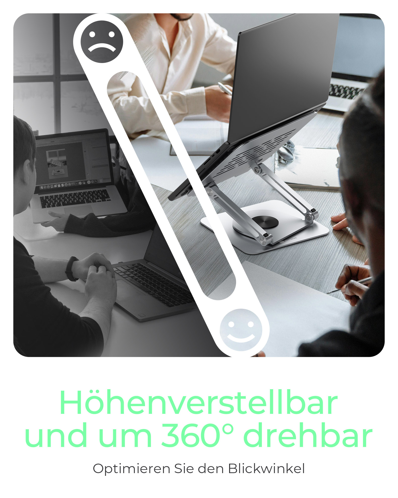 Die integrierte 360° Drehfunktion erlaubt eine flexible Ausrichtung des Geräts, wodurch Inhalte einfach geteilt oder der Arbeitsplatz schnell angepasst werden kann. Die stabile Aluminiumkonstruktion sorgt für eine hohe Belastbarkeit und sicheren Stand, wodurch auch größere Notebooks zuverlässig gehalten werden.