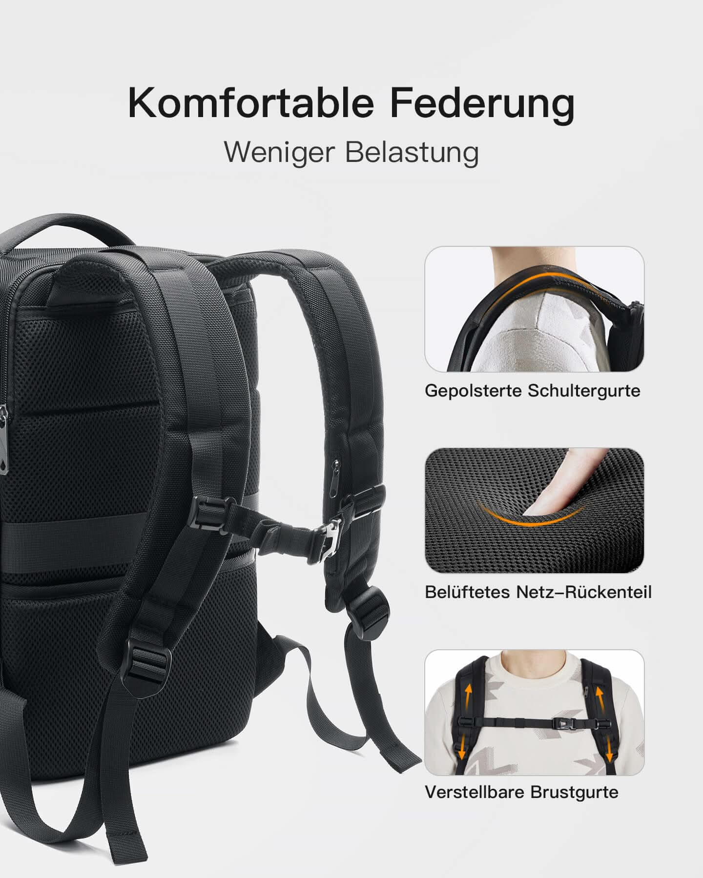 Durch die Erweiterungsfunktion lässt sich das Volumen flexibel anpassen, wodurch der Rucksack je nach Bedarf von kompakt auf großzügigen Stauraum erweitert werden kann. Die gepolsterten Schultergurte und das atmungsaktive Rückenpolster sorgen für hohen Tragekomfort, wodurch der Rucksack auch bei längerer Nutzung angenehm bleibt.