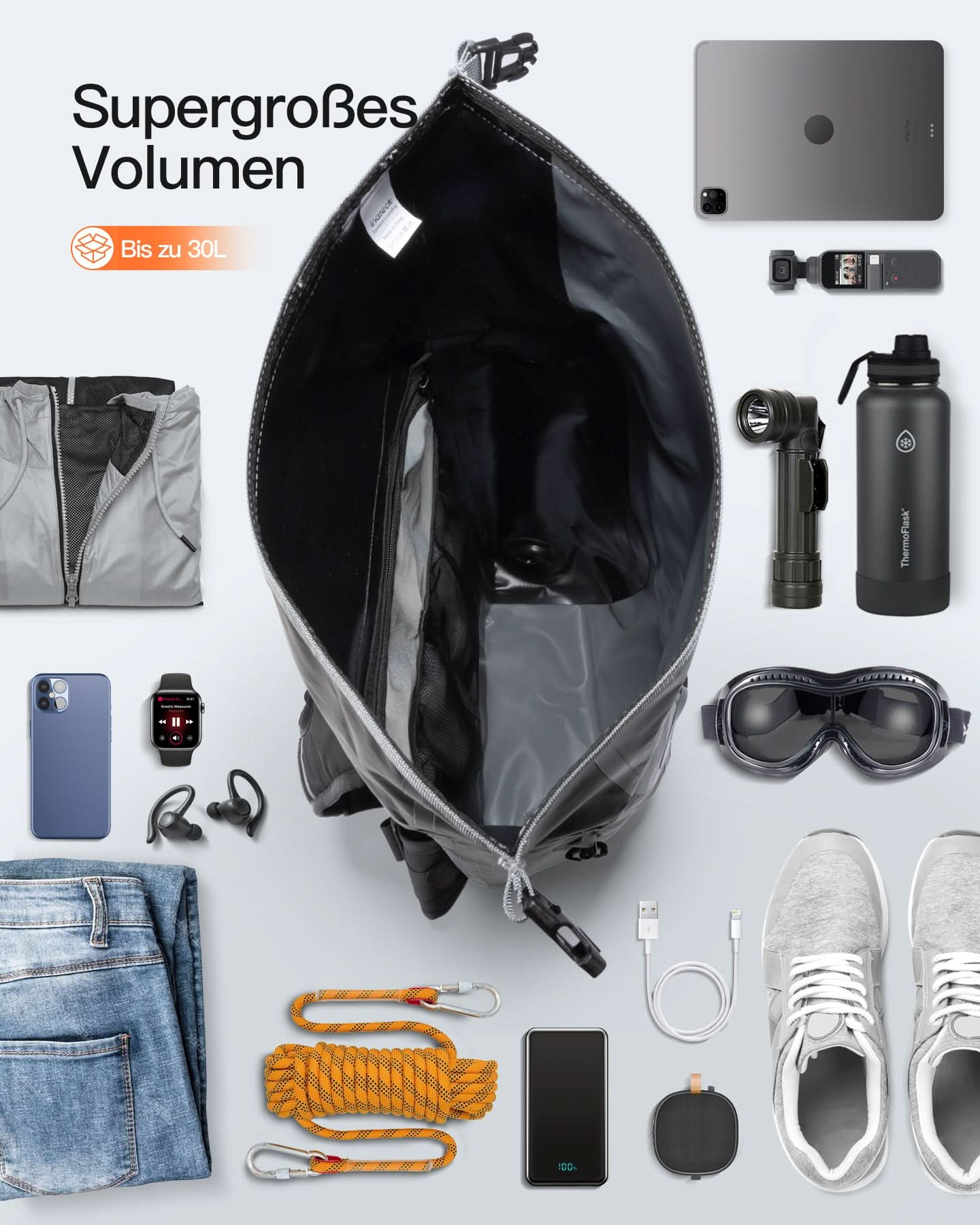Besonderheiten: Rolltop-Verschluss, erweiterbares Volumen, mehrere Fächer, wasserabweisend