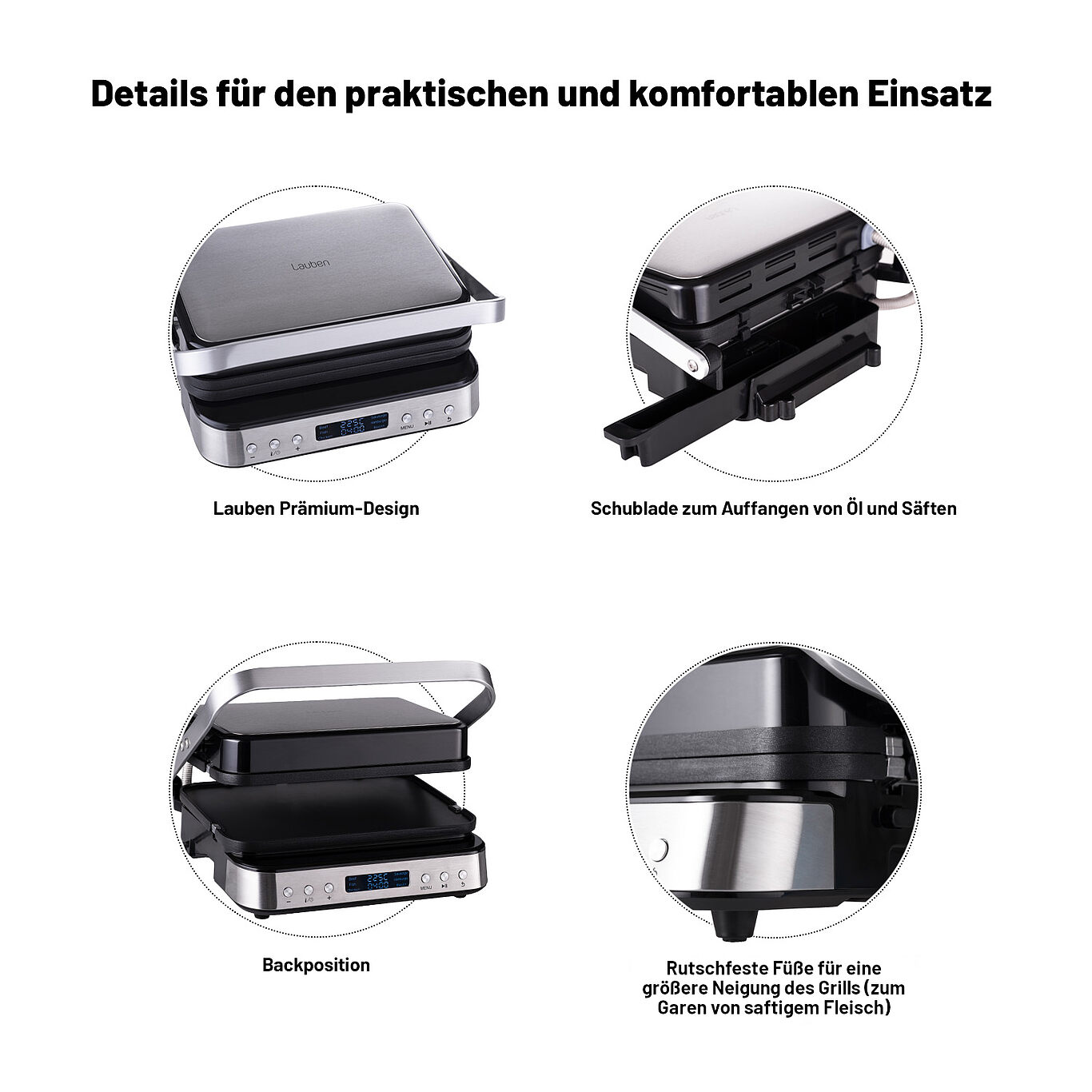 • Einfache Reinigung: Abnehmbare, spülmaschinenfeste Grillplatten und praktische Abtropfschale.