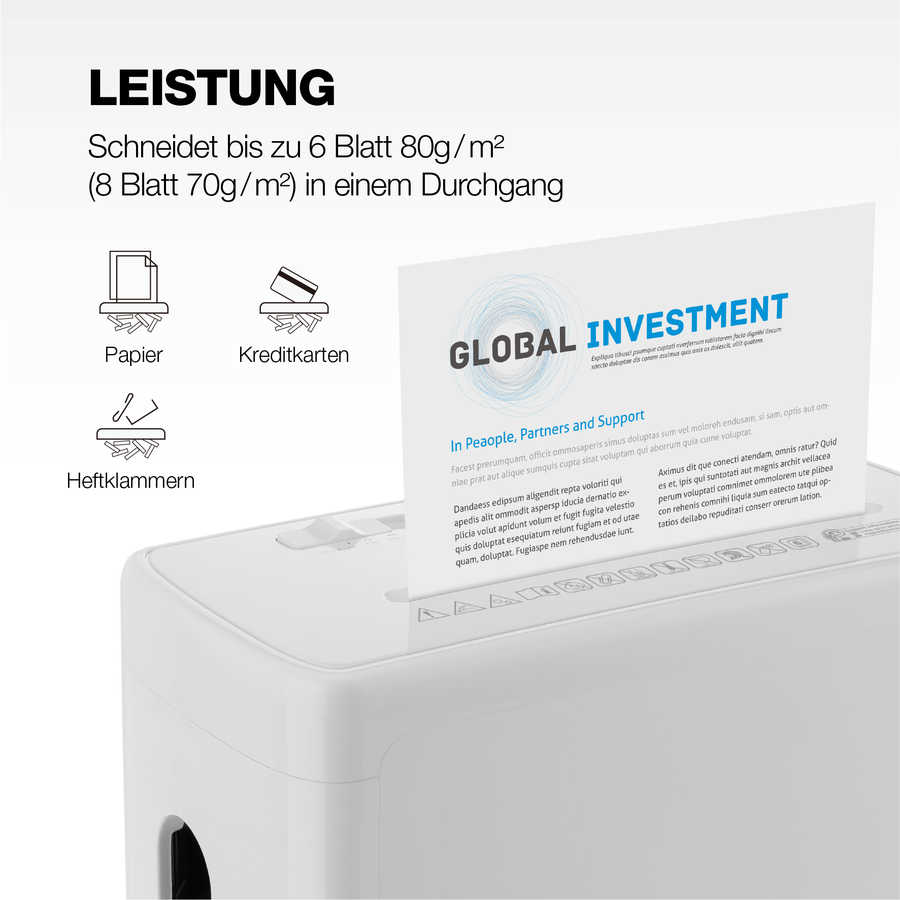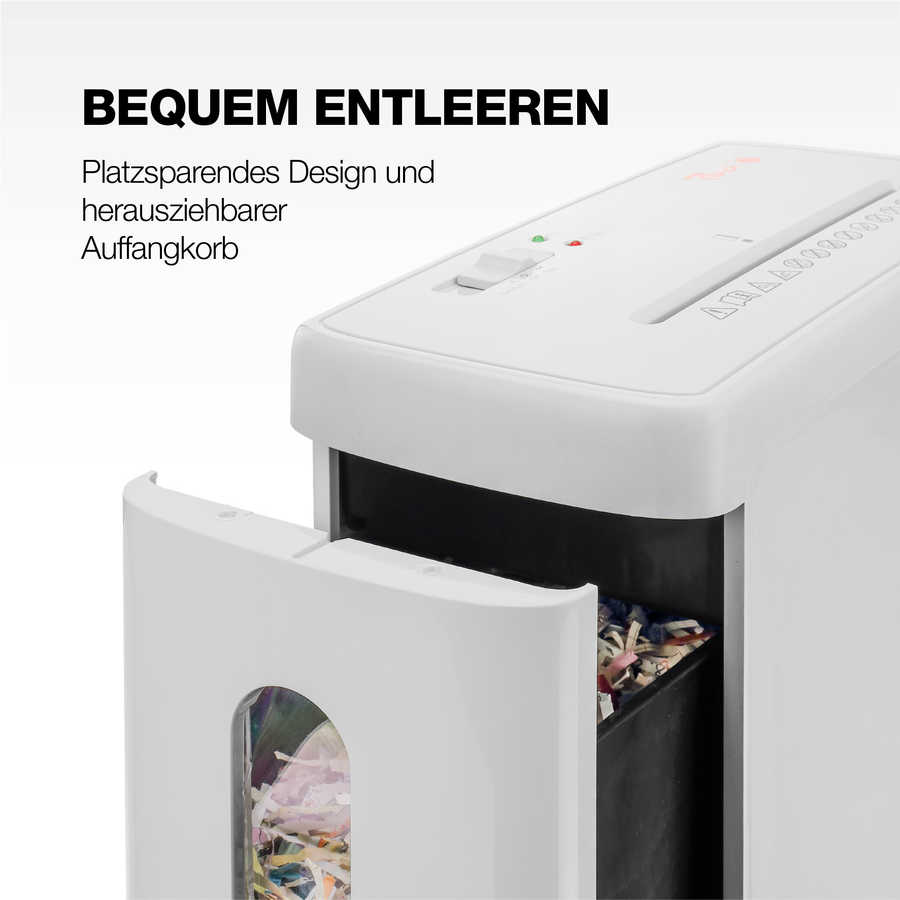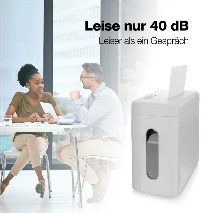 Mit einer Kapazität von bis zu 6 Blatt (80 g/m²) pro Durchgang eignet sich das Gerät ideal für den gelegentlichen Einsatz, wodurch kleinere Papiermengen effizient verarbeitet werden können. Die SuperSilent-Technologie sorgt für eine besonders leise Arbeitsweise, wodurch ein angenehmes und störungsfreies Arbeiten ermöglicht wird.