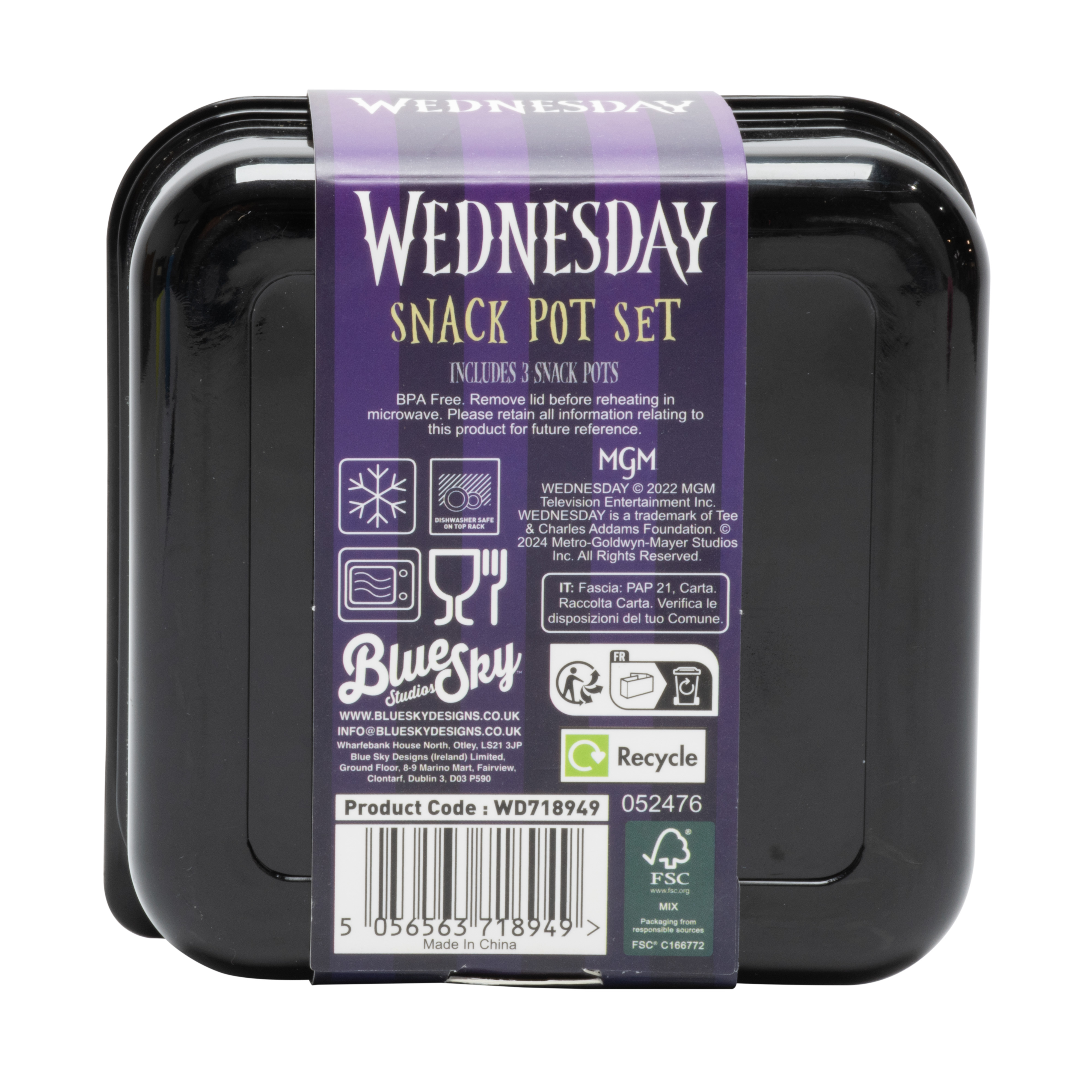 Die Wednesday – 3 in 1 Snack Boxen sind ein offiziell lizenziertes Lunchbox-Set im düsteren Addams-Family-Stil. Das Set besteht aus drei stapelbaren Snack-Pots, die sich