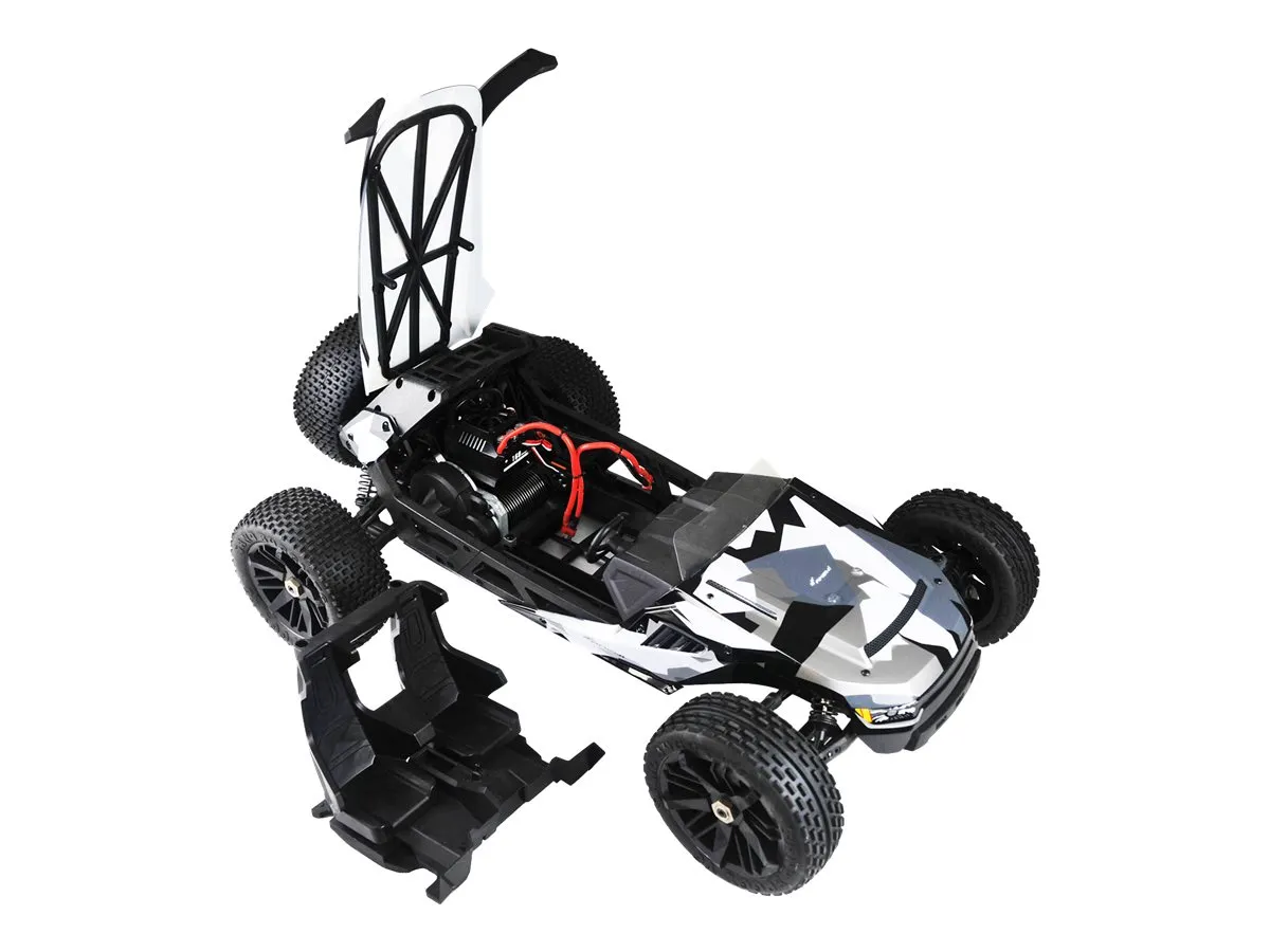 Der Buggy wird ohne Zubehör geliefert, was es ideal für erfahrene RC-Piloten macht, die bereits über Ladegerät, Akku und Fernsteuerung verfügen. Die langlebige Bauweise und die leistungsstarke Technik machen den Hammerhead zu einem verlässlichen Begleiter bei actionreichen Fahrten.