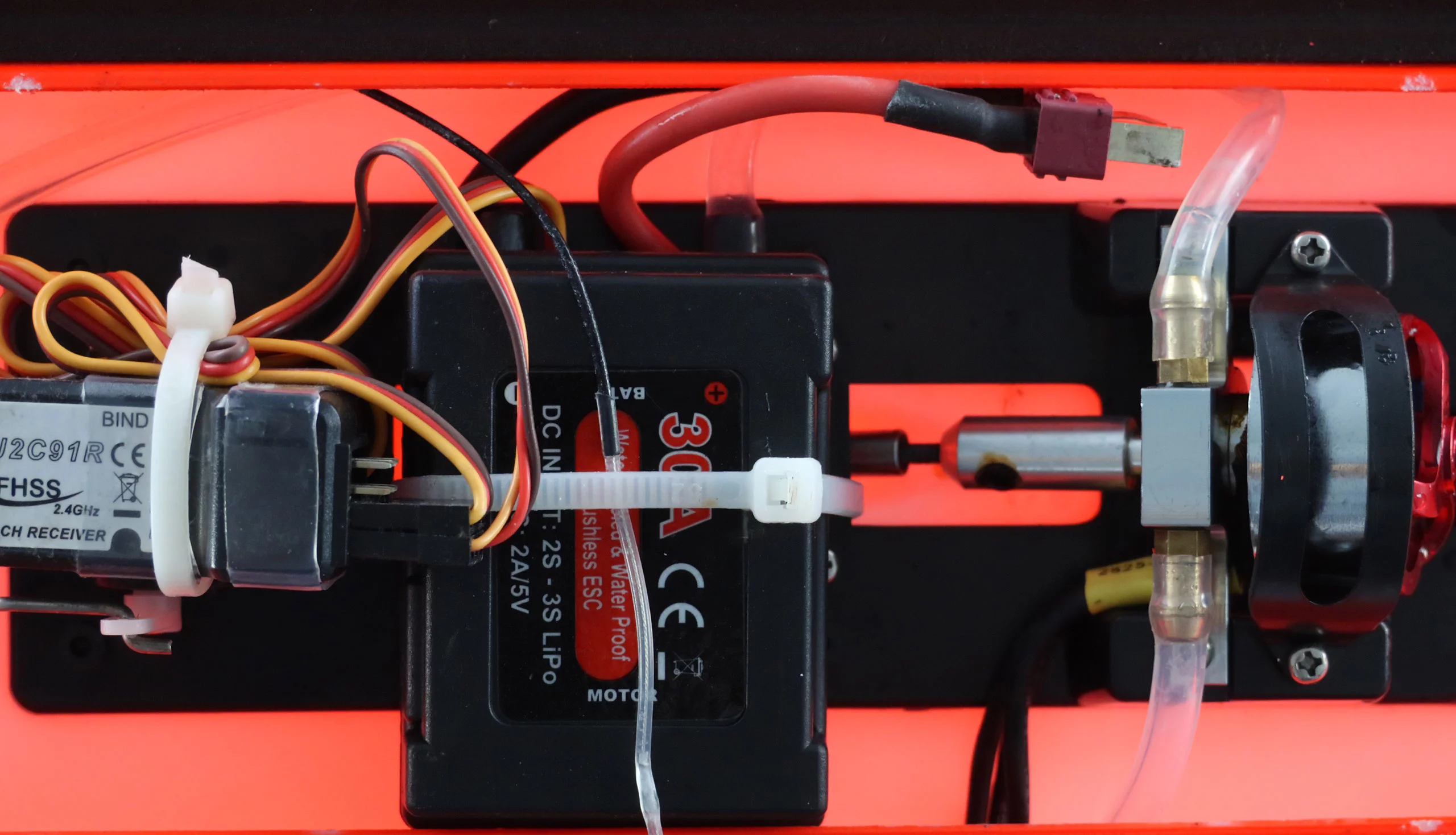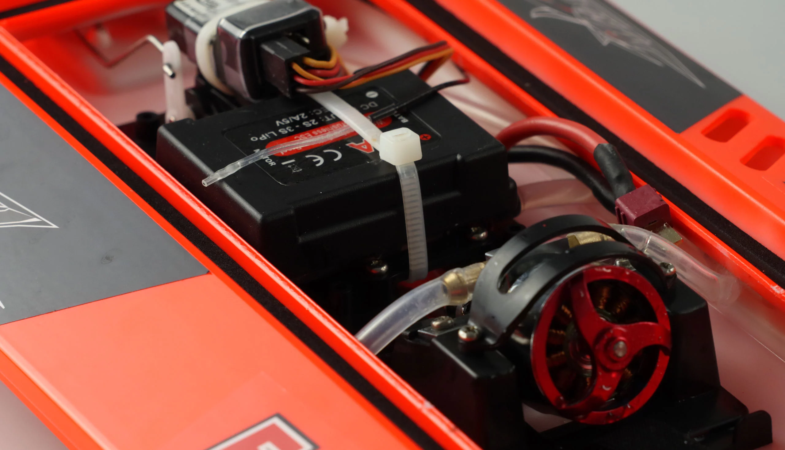 Die Mad Shark V2 ist mit einem wassergekühlten 2212 brushless Außenläufer mit 3300KV ausgerüstet, dadurch sind Geschwindigkeiten von bis zu 60km/h möglich. Der 430mm lange Rumpf ist aus einem schlagfesten ABS Kunststoff tiefgezogen und hochwertig lackiert. Die