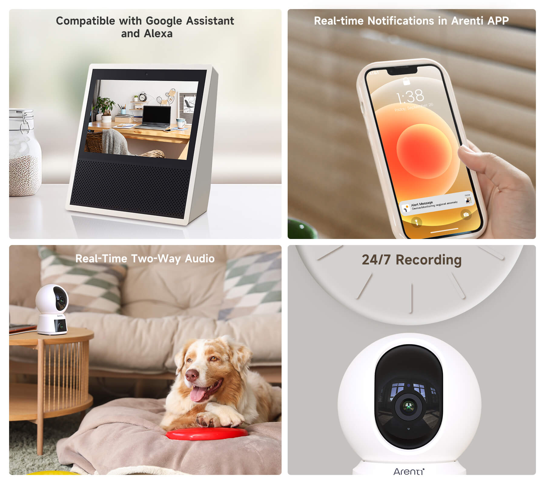 Die Kamera unterstützt Dual-Band Wi-Fi (2.4 GHz & 5 GHz) und ist mit Bewegungserkennung, Zwei-Wege-Audio und Nachtsicht ausgestattet. Über die Arenti-App (Android/iOS) lassen sich Live-Bilder abrufen, Aufnahmen speichern und Benachrichtigungen empfangen. Sie ist ideal für die Innenraumüberwachung von Wohnräumen, Büros oder Kinderzimmern.