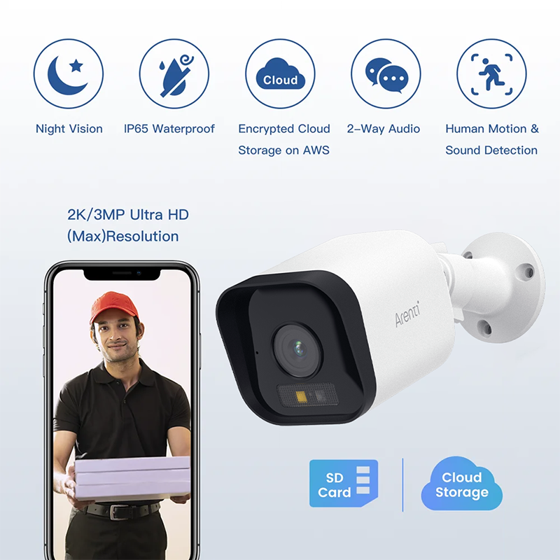 Mit der Arenti-App (Android/iOS) lassen sich Live-Bilder abrufen, Aufnahmen speichern und Benachrichtigungen empfangen. Die Kamera ist wetterfest und für den Outdoor-Einsatz optimiert. Dank moderner H.265-Komprimierung und optionaler Cloudanbindung ist eine effiziente Speicherung gewährleistet.