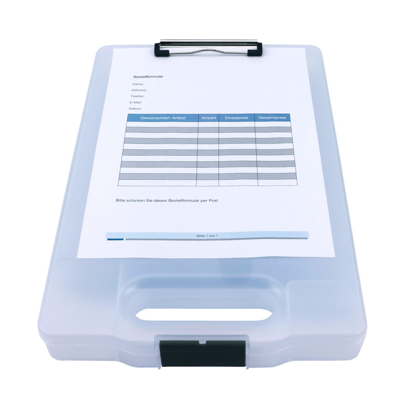 Die transparente Ausführung ermöglicht eine schnelle Sicht auf den Inhalt, wodurch Dokumente leichter organisiert und identifiziert werden können. Das Gehäuse aus widerstandsfähigem Kunststoff ist bruchsicher und feuchtigkeitsabweisend, wodurch sich das Klemmbrett auch für den täglichen Einsatz eignet.