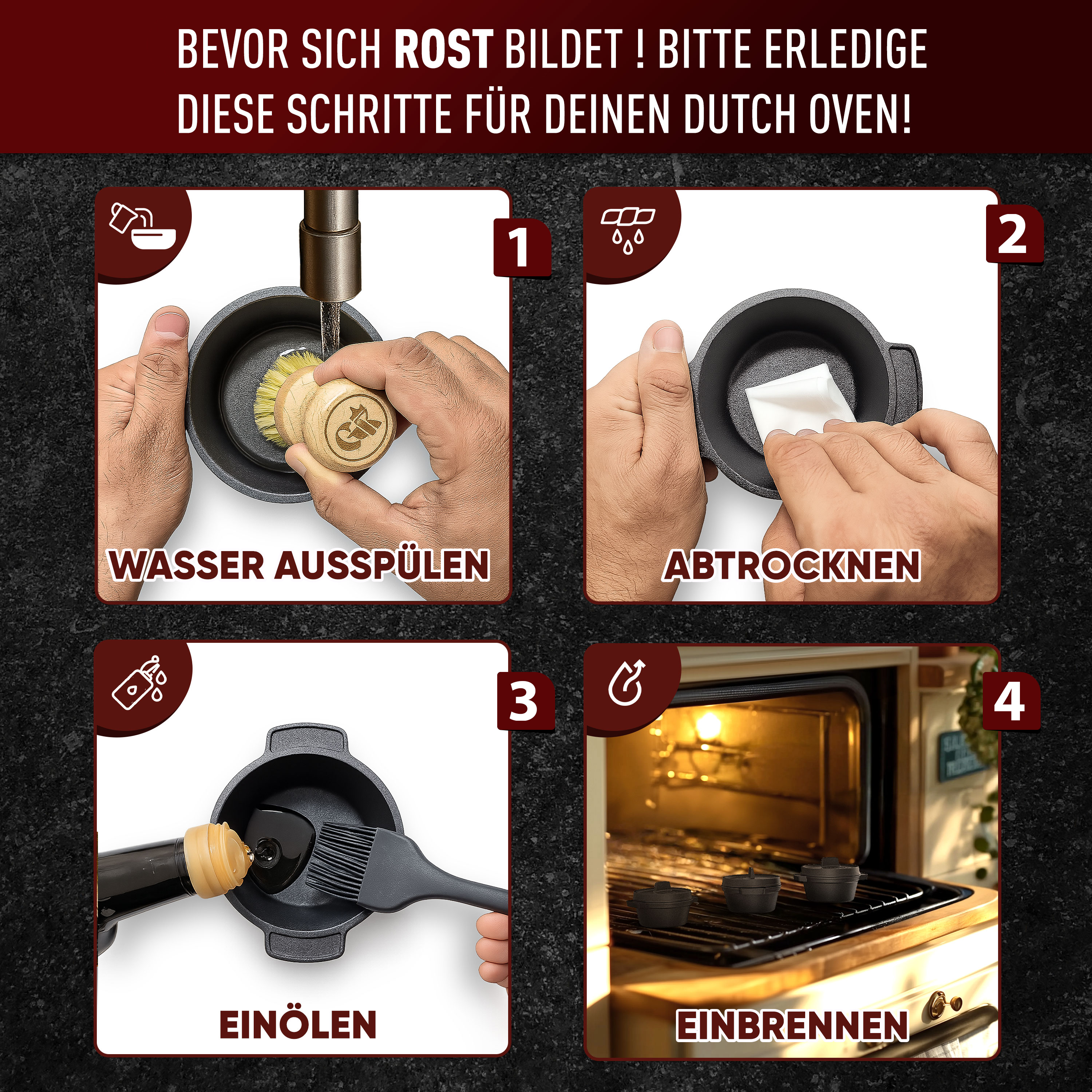 Das GUSSKÖNIG Mini Dutch Oven Set besteht aus sechs kleinen Gusseisentöpfen mit einem Fassungsvermögen von jeweils 300 ml. Die Töpfe werden bereits eingebrannt geliefert und sind ohne zusätzliche Vorbereitung sofort einsatzbereit.