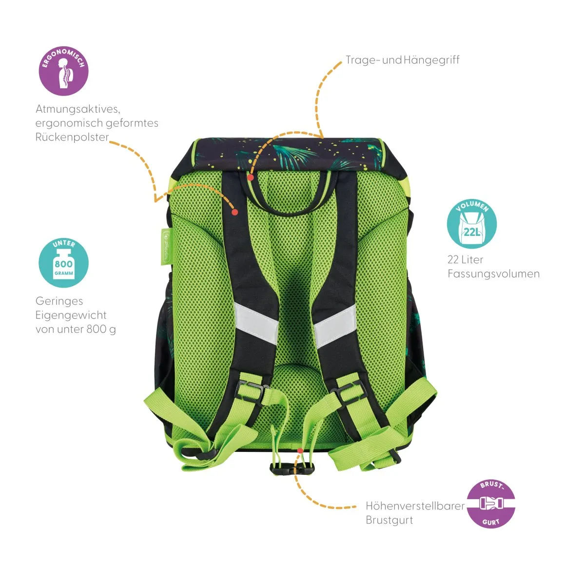 Das gepolsterte, atmungsaktive Rückenpolster sorgt für ein angenehmes Tragegefühl, während die verstellbaren Schultergurte und der höhenverstellbare Brustgurt eine perfekte Passform garantieren. Das geräumige Hauptfach mit integriertem Bücherfach, die Fronttasche mit Reißverschluss und die elastischen Seitentaschen bieten genügend Platz für alle wichtigen Schulutensilien.