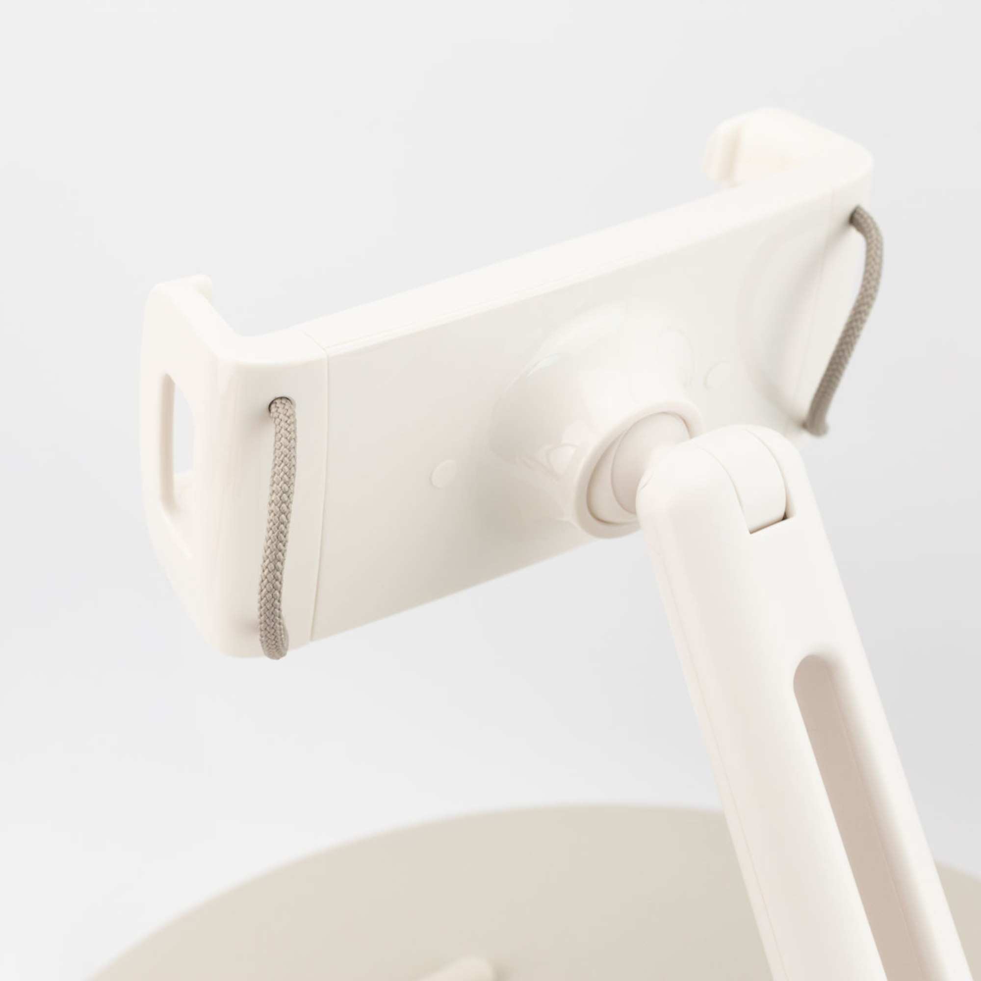 Die Halterung ist direkt in den oberen Bereich des Kissens integriert und lässt sich bei Bedarf ausklappen, wodurch das Gerät flexibel in eine angenehme Sichtposition gebracht werden kann. Die stabile Klemme fixiert Smartphones und kleinere Tablets sicher, wodurch ein sicherer Halt während der Nutzung gewährleistet wird.