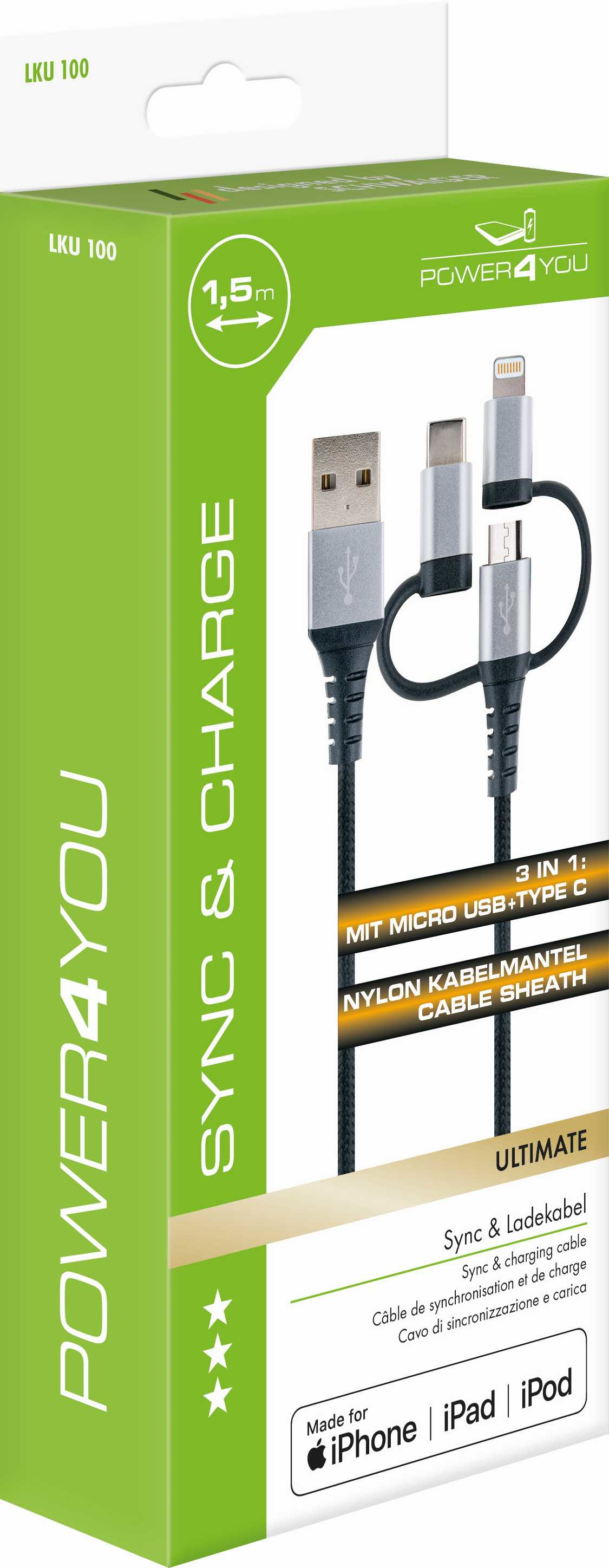 Schwaiger | Ladekabel USB 2.0 A>3-in-1 1,5m schwarz/silber