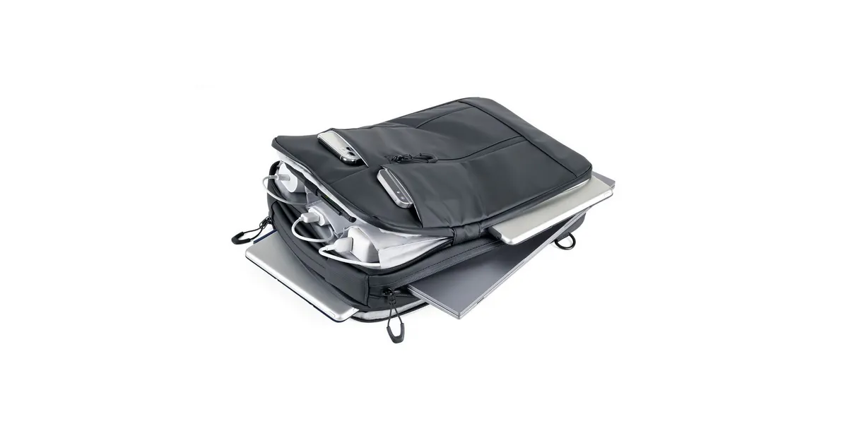 Das durchdachte Innenleben umfasst ein großes Hauptfach mit Laptopfach, mehrere Steck- und Reißverschlussfächer sowie Organizer-Elemente für Stifte, Kabel und kleinere Utensilien. Außen sorgen zusätzliche Fächer für schnellen Zugriff auf Smartphone, Schlüssel oder Trinkflasche. Die Tasche ist aus robustem Polyester gefertigt und überzeugt durch ihr elegantes schwarzes Design mit modernen Akzenten.