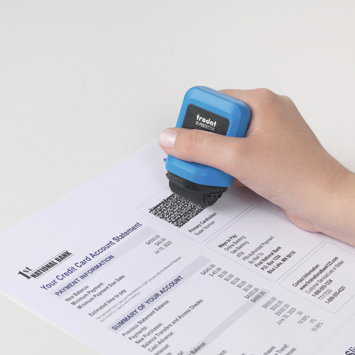 Der selbstfärbende Mechanismus sorgt für sofort einsatzbereite Abdrucke, wodurch kein separates Stempelkissen erforderlich ist. Gleichzeitig gewährleistet die gleichmäßige Farbverteilung ein dichtes und sicheres Abdecken sensibler Inhalte, wodurch ein hohes Maß an Datenschutz erreicht wird.