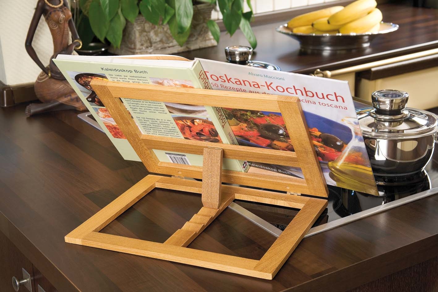 Der verstellbare Neigungswinkel erlaubt eine individuelle Anpassung an die gewünschte Leseposition, wodurch Nacken und Augen entlastet werden können. Eine integrierte Metallkette hält die Seiten zuverlässig offen, wodurch auch dickere Bücher komfortabel genutzt werden können.