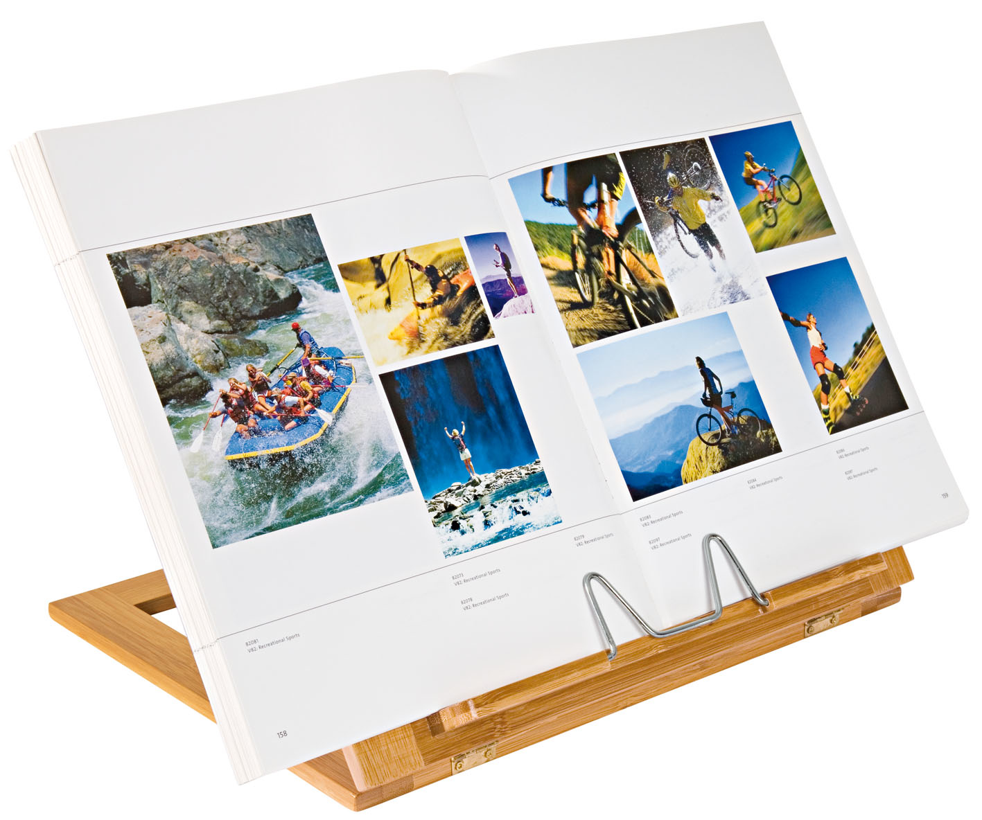 Besonderheiten: verstellbarer Winkel, faltbar, Metallkette zum Fixieren der Seiten