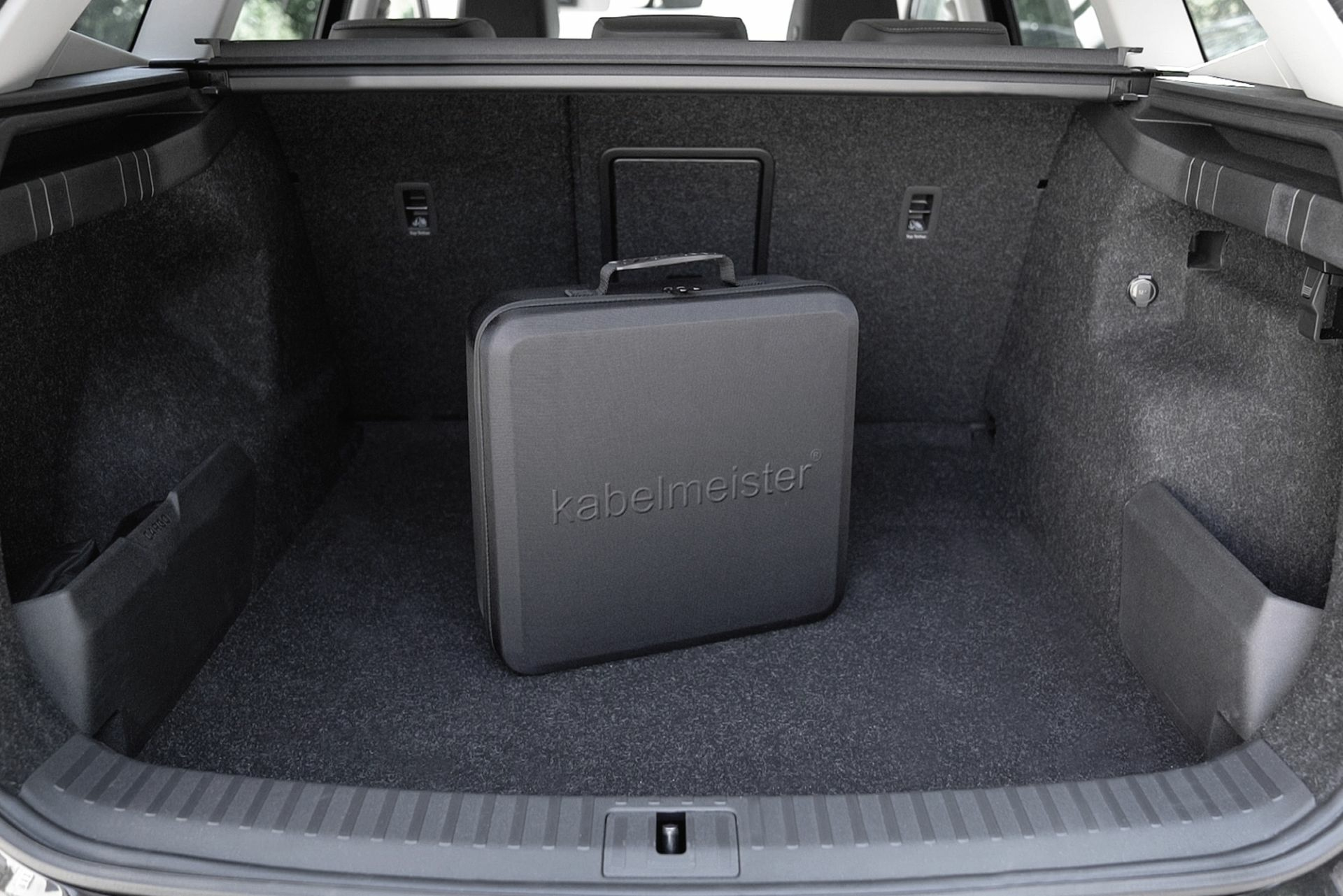 Der Kabelmeister Aufbewahrungskoffer ist eine praktische Lösung, um E-Auto-Ladekabel sauber und geschützt im Fahrzeug zu verstauen. Statt lose im Kofferraum zu liegen, lässt sich das Kabel geordnet unterbringen und bei Bedarf schnell wieder entnehmen. Dadurch wird Kabelsalat vermieden und der Innenraum bleibt übersichtlich.