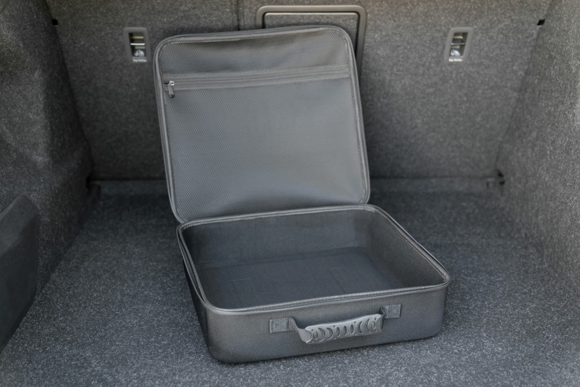 Für einen sicheren Halt im Fahrzeug sorgen zwei rückseitige Klettstreifen, die ein Verrutschen im Kofferraum verhindern. Ein stabiler Tragegriff ermöglicht zudem einen einfachen Transport des Koffers.